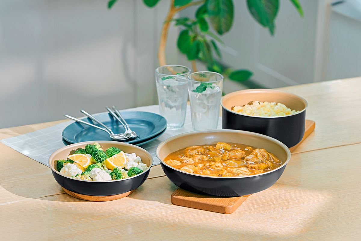 フライパン自体のデザインもシンプルなので、食卓の雰囲気を崩しにくく、調理後の料理をアツアツのまま味わえるのがうれしい。