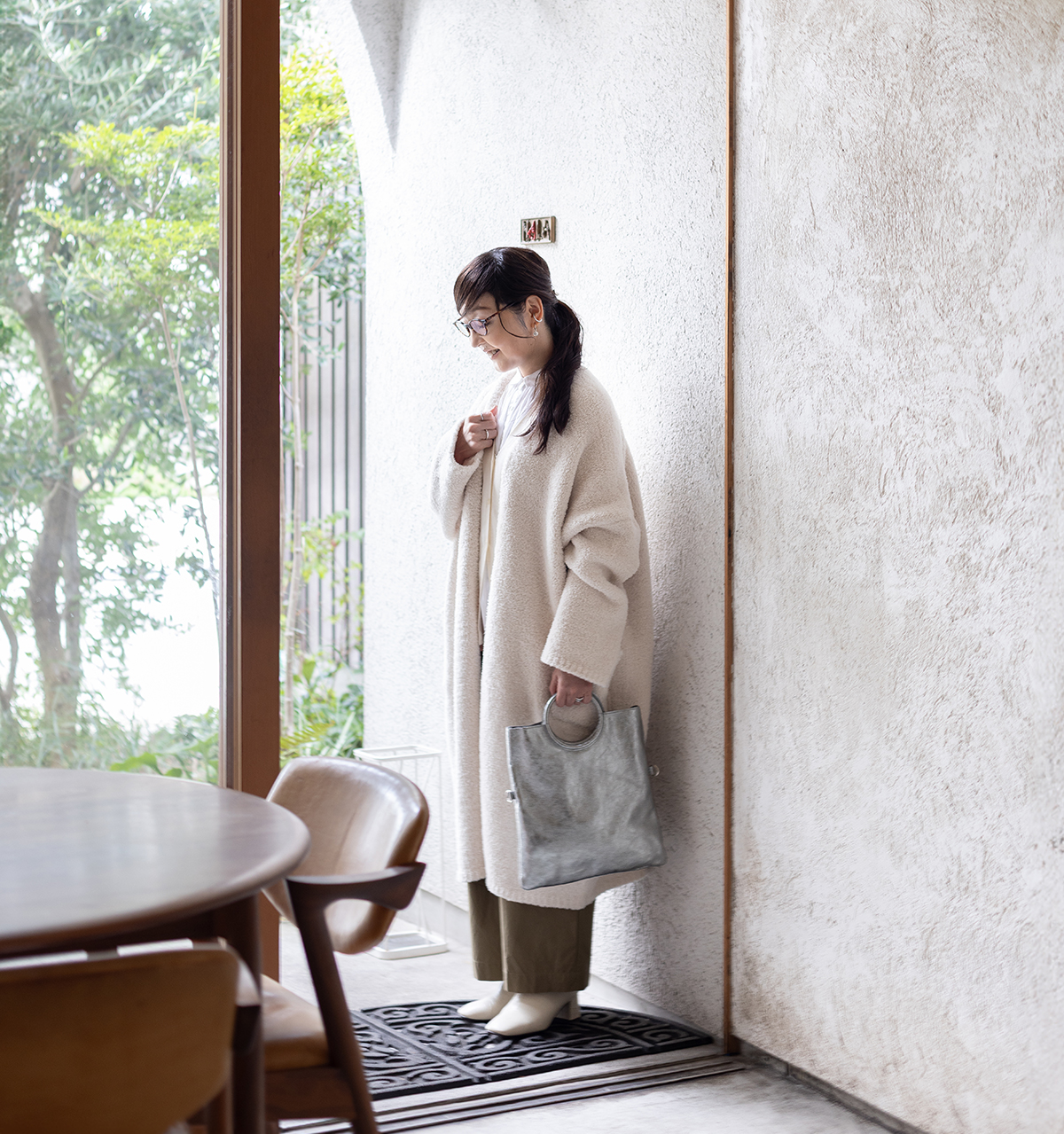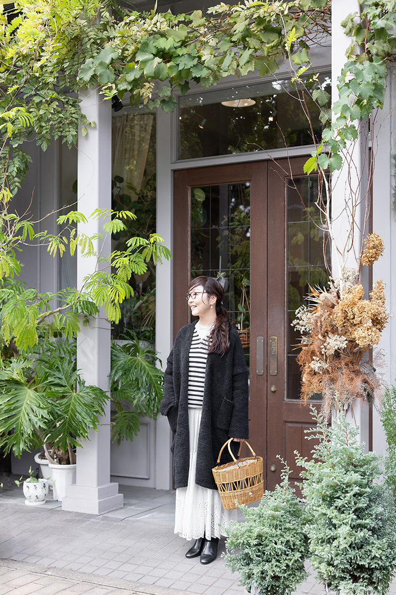ちょっとおめかしして訪れたいフレンチレストランには、ワンサイズ大きめのアイボリーのカーディガンをコートのようにはおって。少し丈が長くなりボリュームが出ることで、おしゃれ感が増すような気がします。