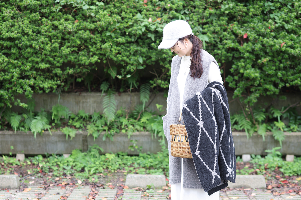 ちょっと抜け感が出るように、かごバッグとサンダルを合わせました。