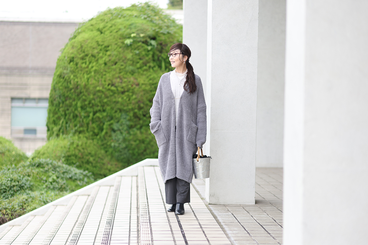 見たかった企画展があった美術館には、グレーのカーディガンを着て。