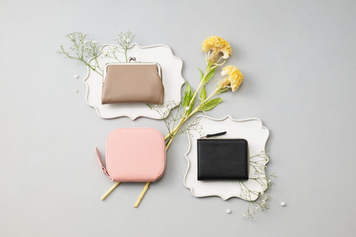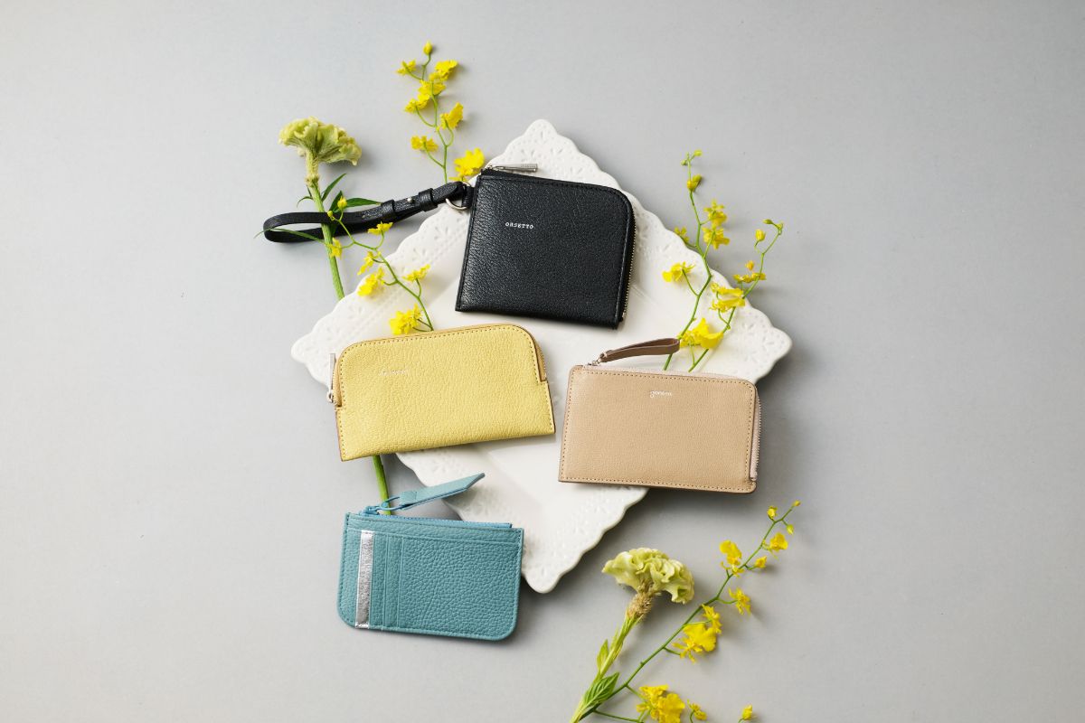 上:可憐な花をあしらったデザイン。ブラウンカラーが安定をもたらし、大切な人との絆を確かなものに。カードケースやコイン入れの丸みのある形もポイント。