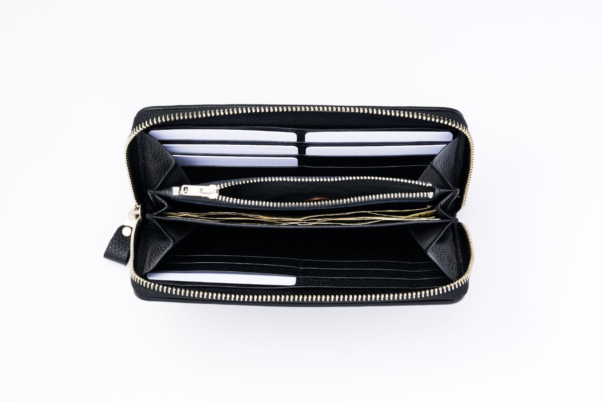 上:「水」の気を持ち、「火」を抑えてくれる黒は健康運を高めると同時に、無駄使いを減らす効果も。内側は8つのカード入れとコインポケットが。ストラップ付き。