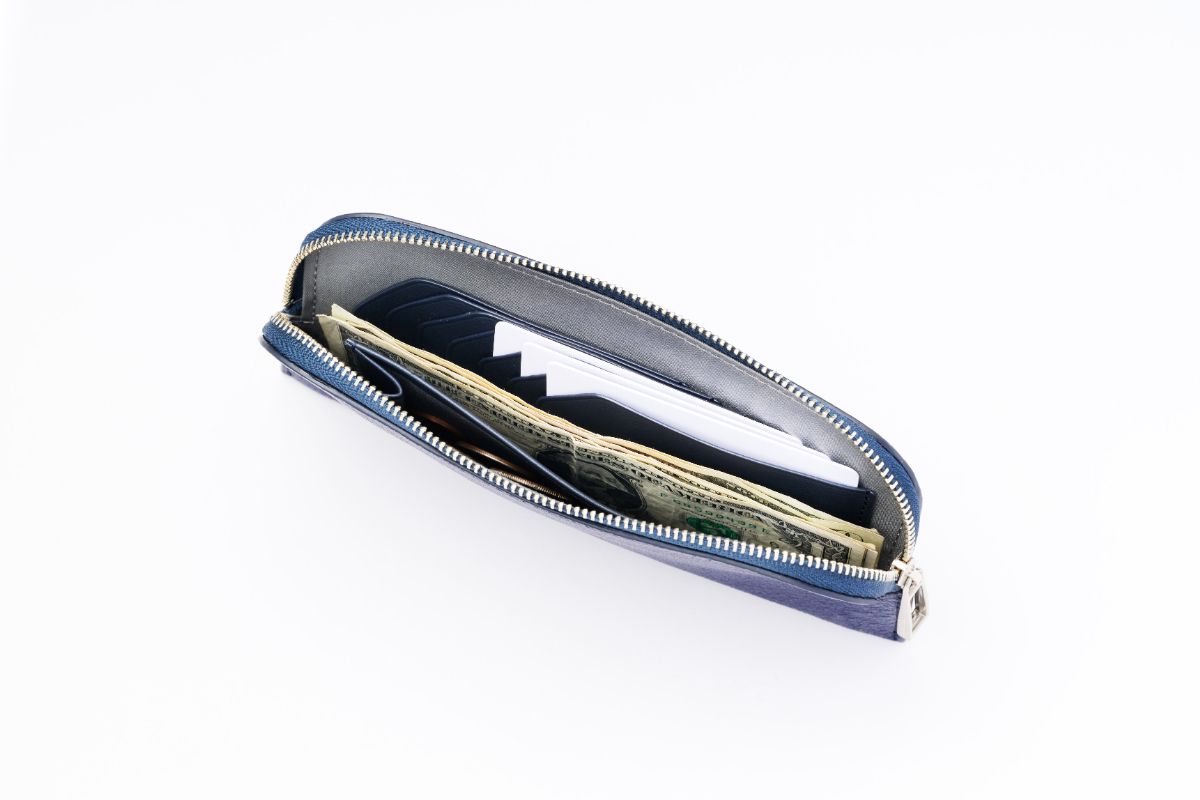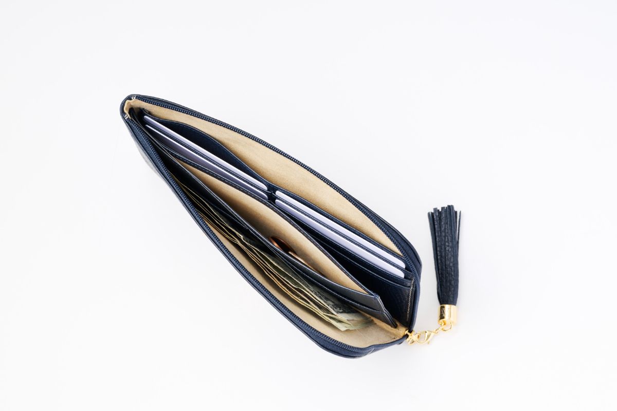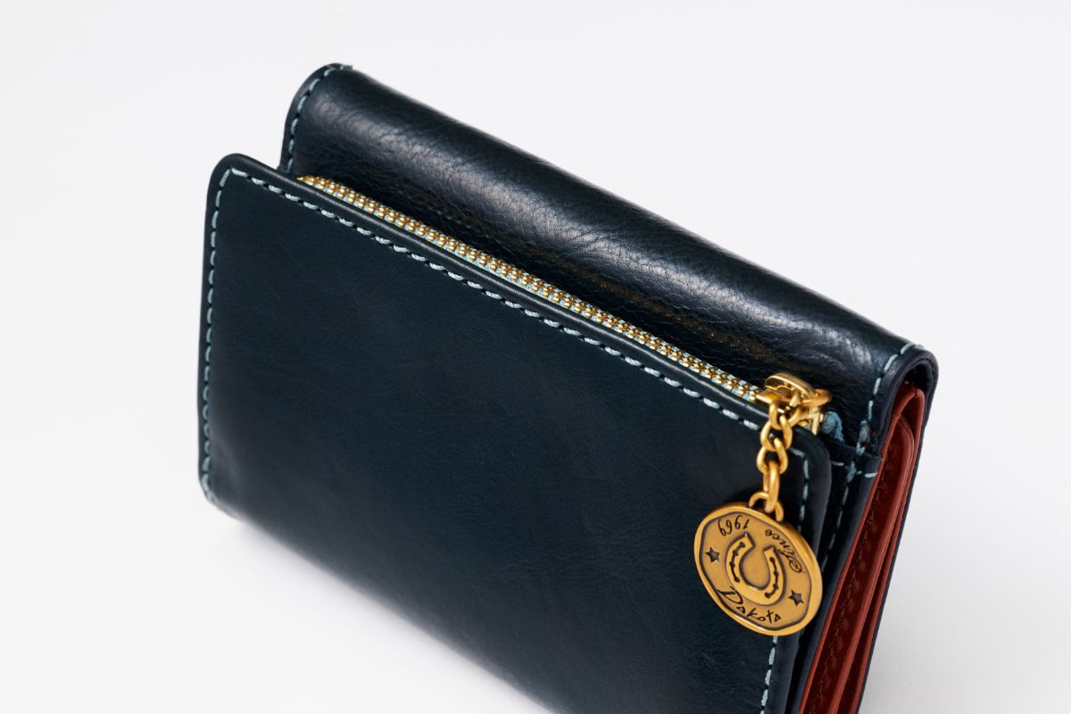 右上:黒に近いネイビーが無駄使いをセーブし、ゴールドカラーのプレートが金運を引き寄せます。スリムながらカードが8枚収納でき、ファスナーレスのコインケースで出し入れもスムーズ。