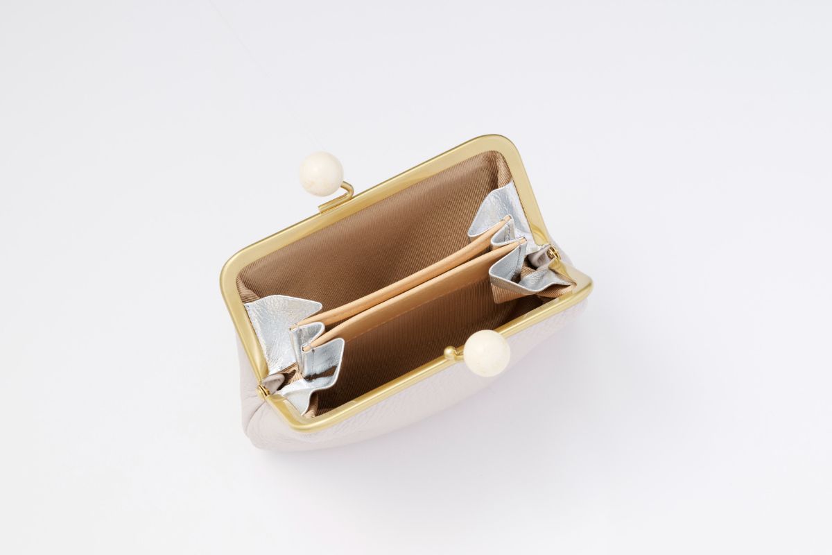 中:玉パーツを口金にあしらったがま口が家庭運を守ってくれます。手なじみのいいふっくらした柔らかなフォルムで、見ても触れてもやさしい気持ちになれそう。