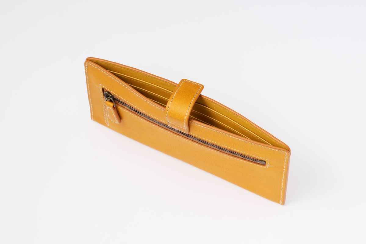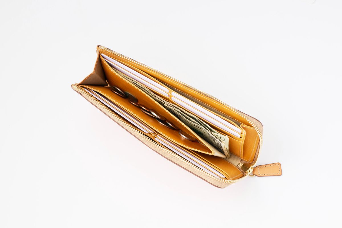 上:ヌメ革のマットな質感とナチュラルな色合いが「火」の力を整えてくれます。ジッパー式の長財布ならさらに金運をがっちりキャッチする効果も。中身が確認しやすく使い勝手のよさも最高です。