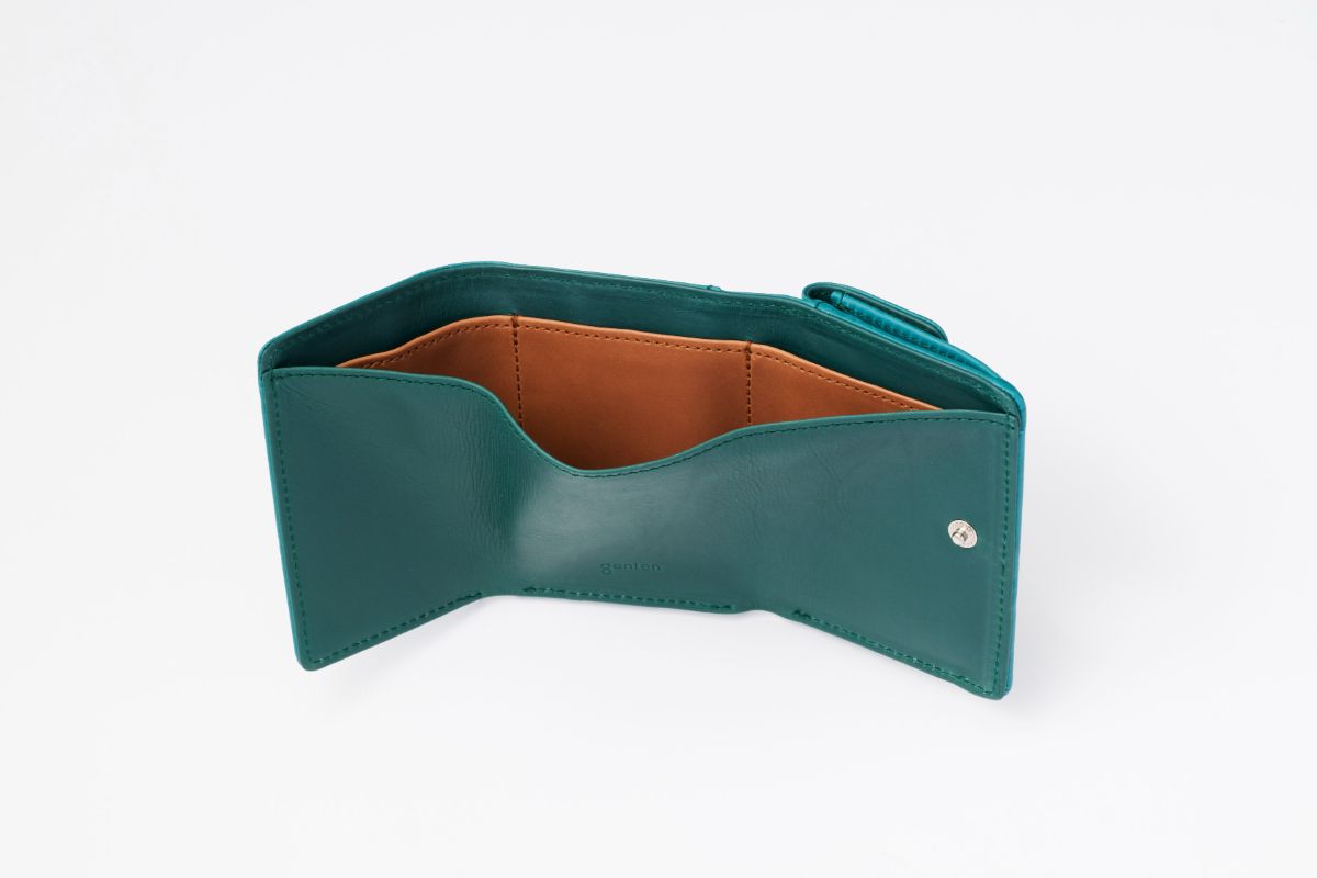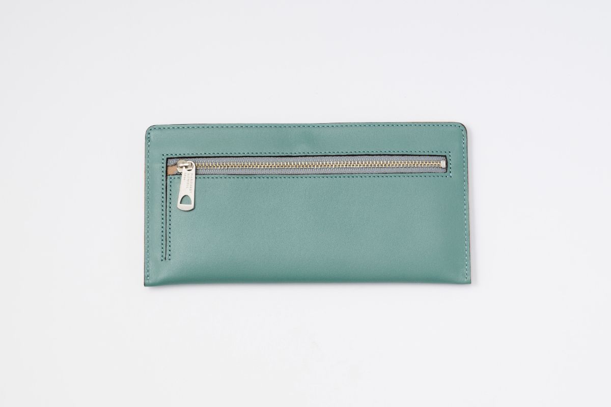 下:ブルーグリーンは創造力や企画力を高めて、新しい可能性を広げてくれる色。仕事運を高めたい人にぴったり。背面ジップで小銭の出し入れも便利。