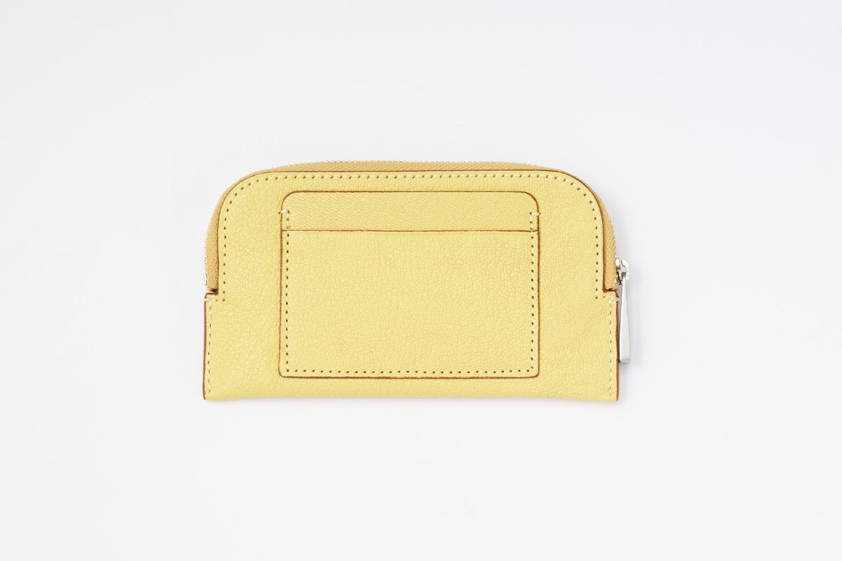 中左:丸みのあるフォルムが愛らしい。イエローには「土」の気が宿り、金運を引き上げてくれます。カード入れが外側に2つ 、内 側に5つあり、小銭を入れるポケットも配置。