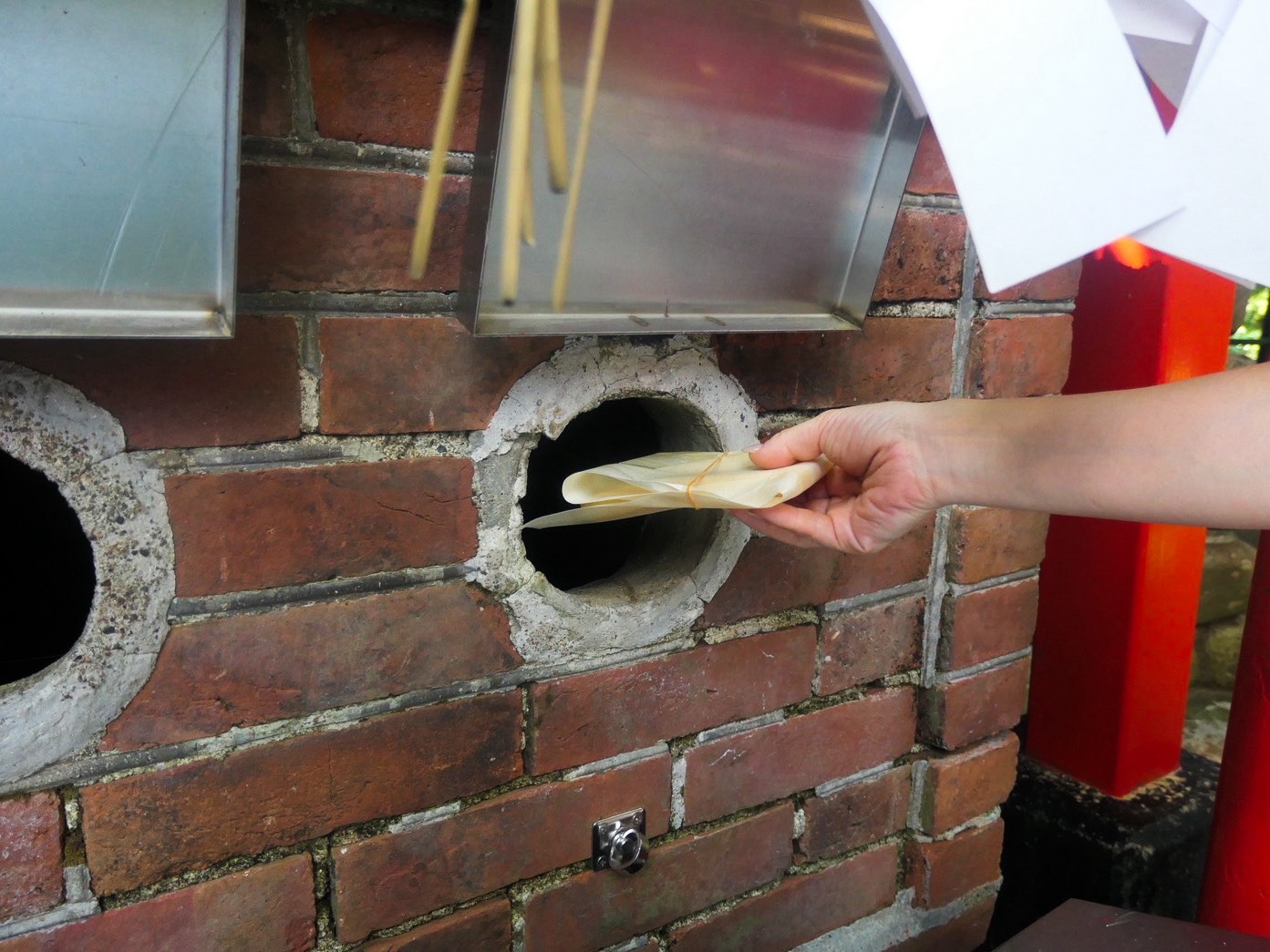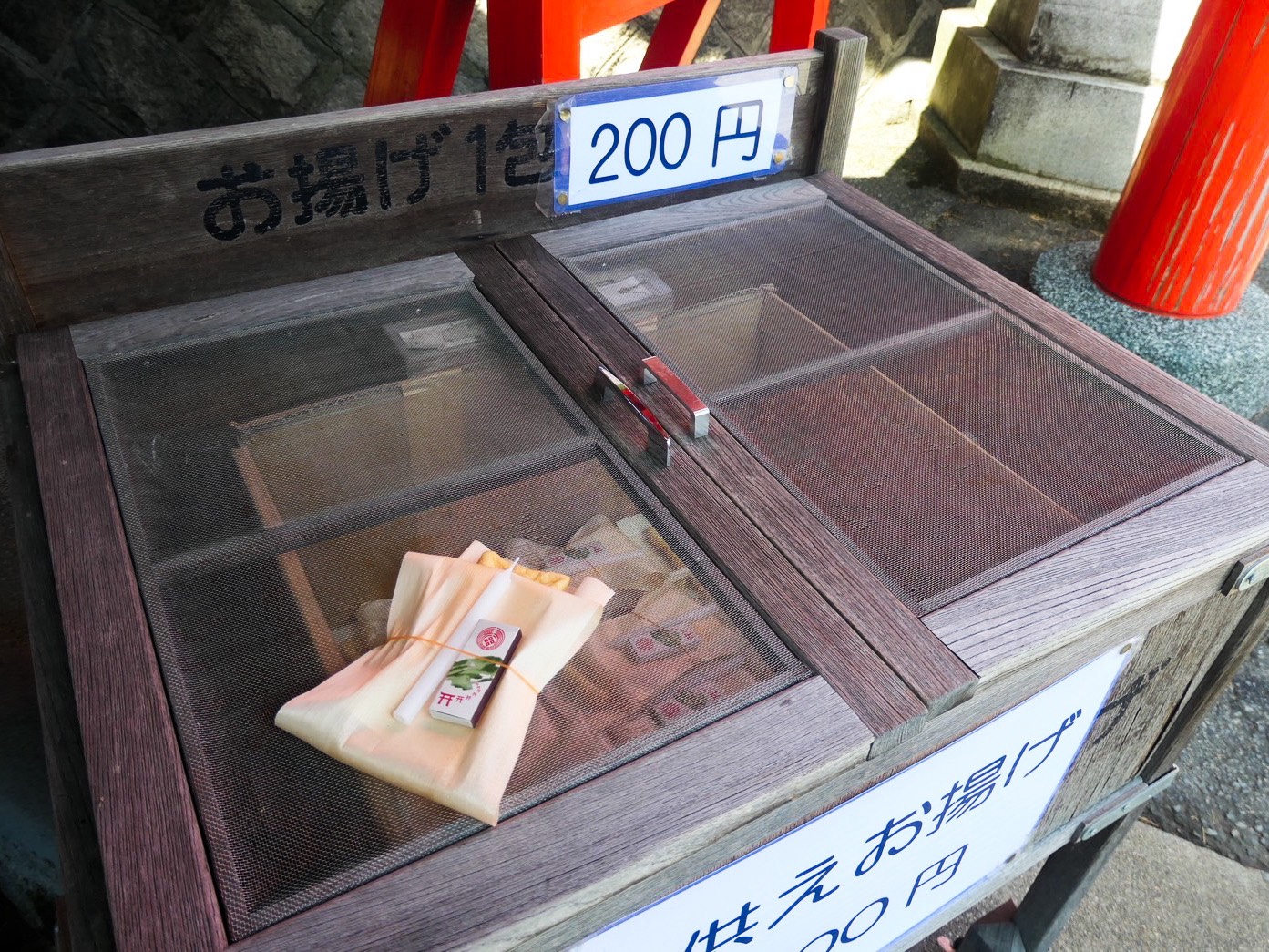 境内で「お揚げローソク」のセットを購入。太皷谷稲成神社では、神様の御使いである狐に好物である油揚げをお供えします。