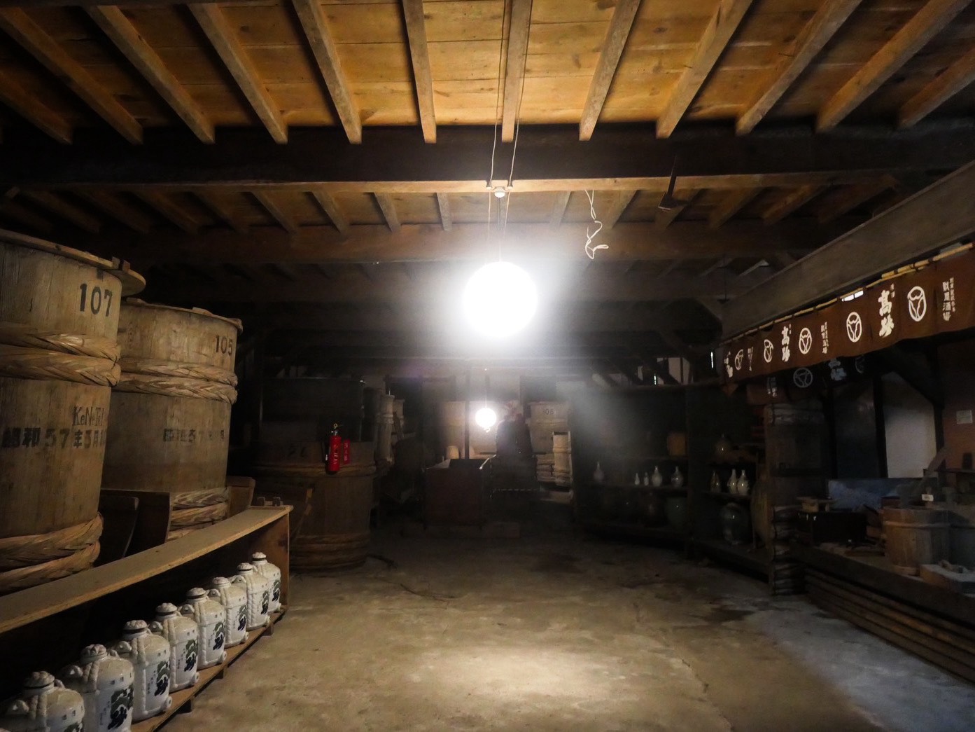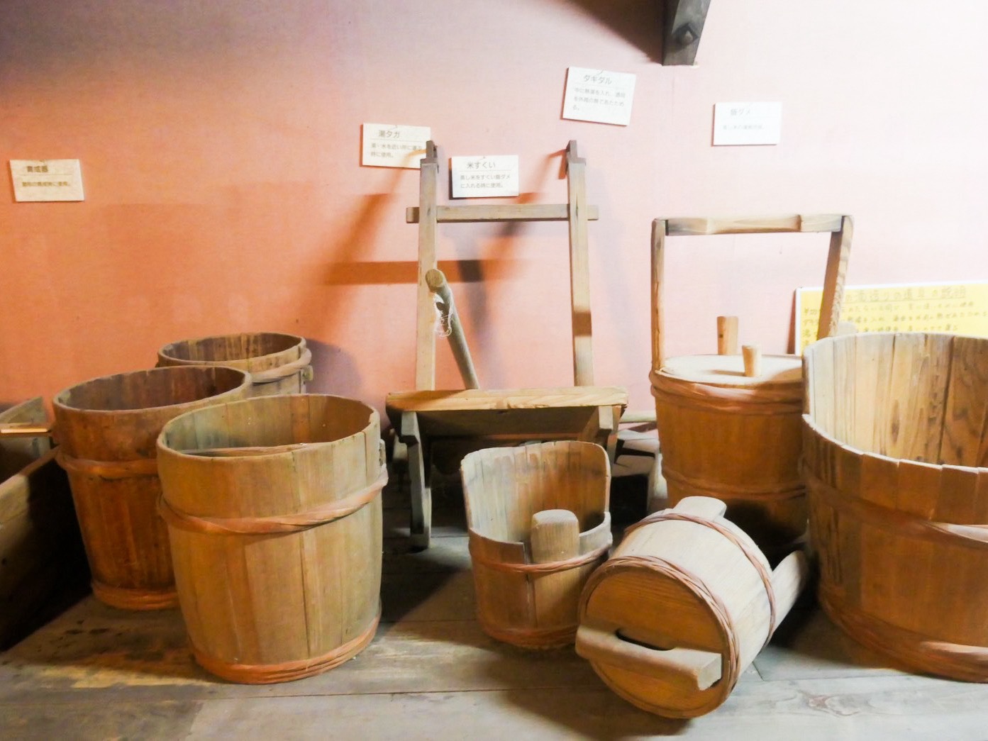 資料館には長い歴史をもつ老舗酒造ならではの品々。今でこそ日本酒の醸造はホーローやステンレス製のタンクが主流ですが、ここには杉材で作られた大樽が。これらは昭和34年あたりまで使われていたそう。ほかにも年季の入った道具の数々が展示されています。