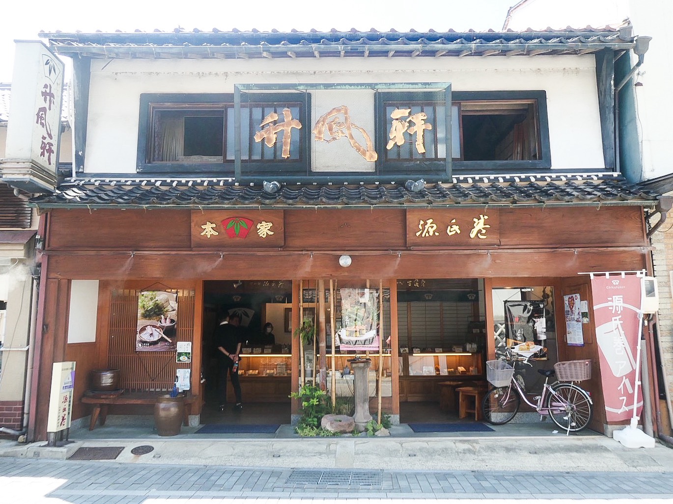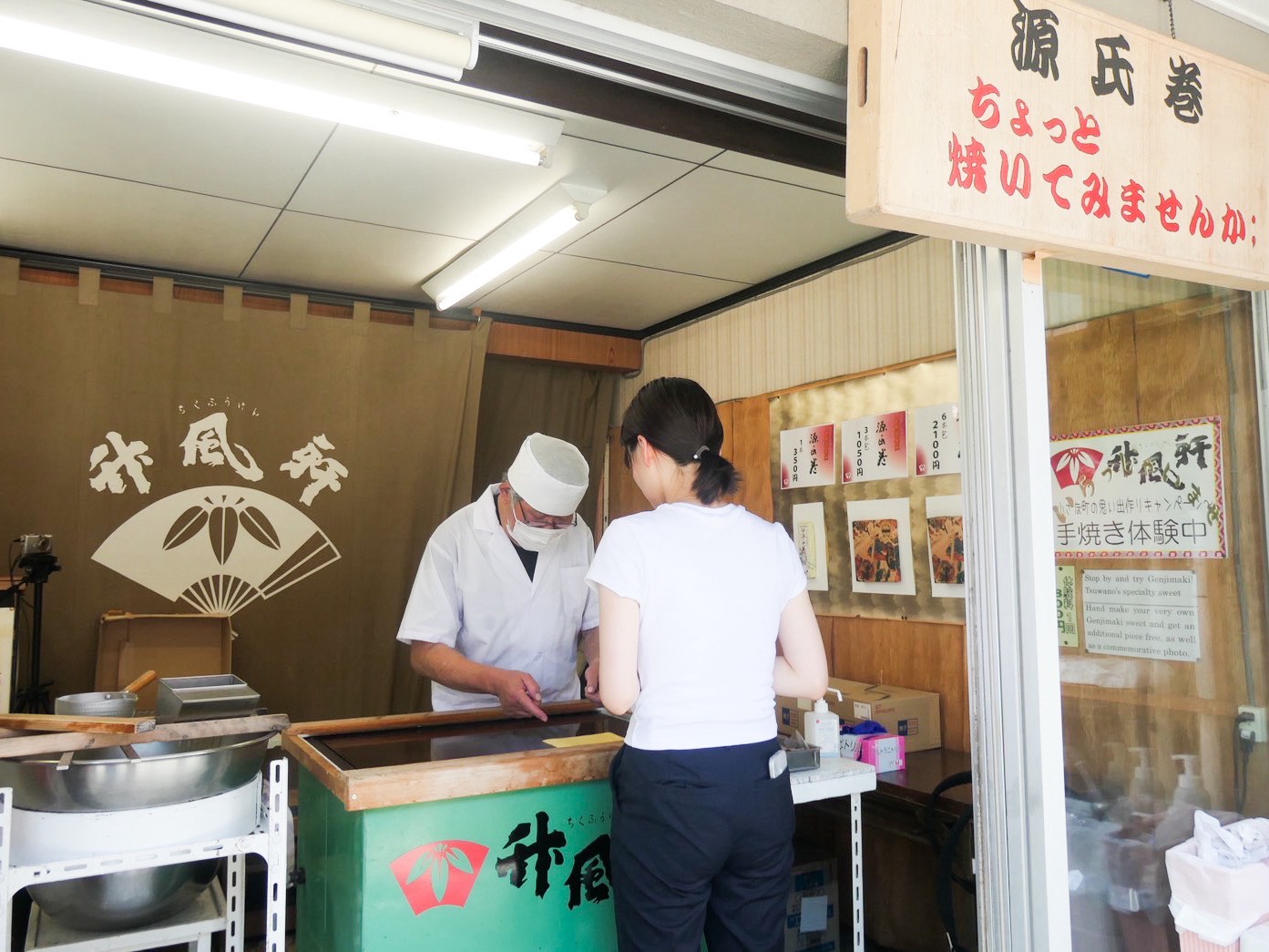 ご飯を食べた後は甘いものを求め再び散策。辿り着いたのは、明治18年創業の山田竹風軒本店 本町店です。津和野名物「源氏巻」をはじめ、いろいろなお菓子を楽しめるお店。お土産はもちろん、店舗横には津和野の名物「源氏巻」を実際に作ることができる体験コーナーも。