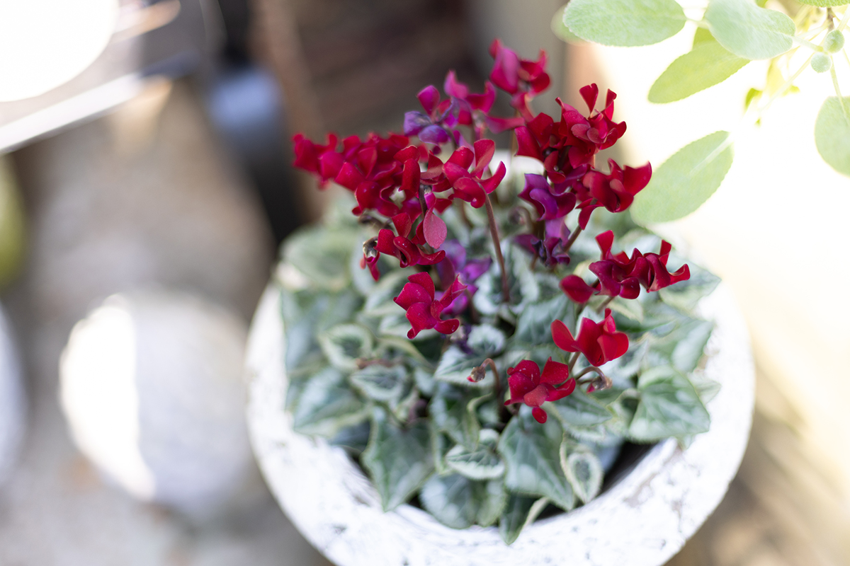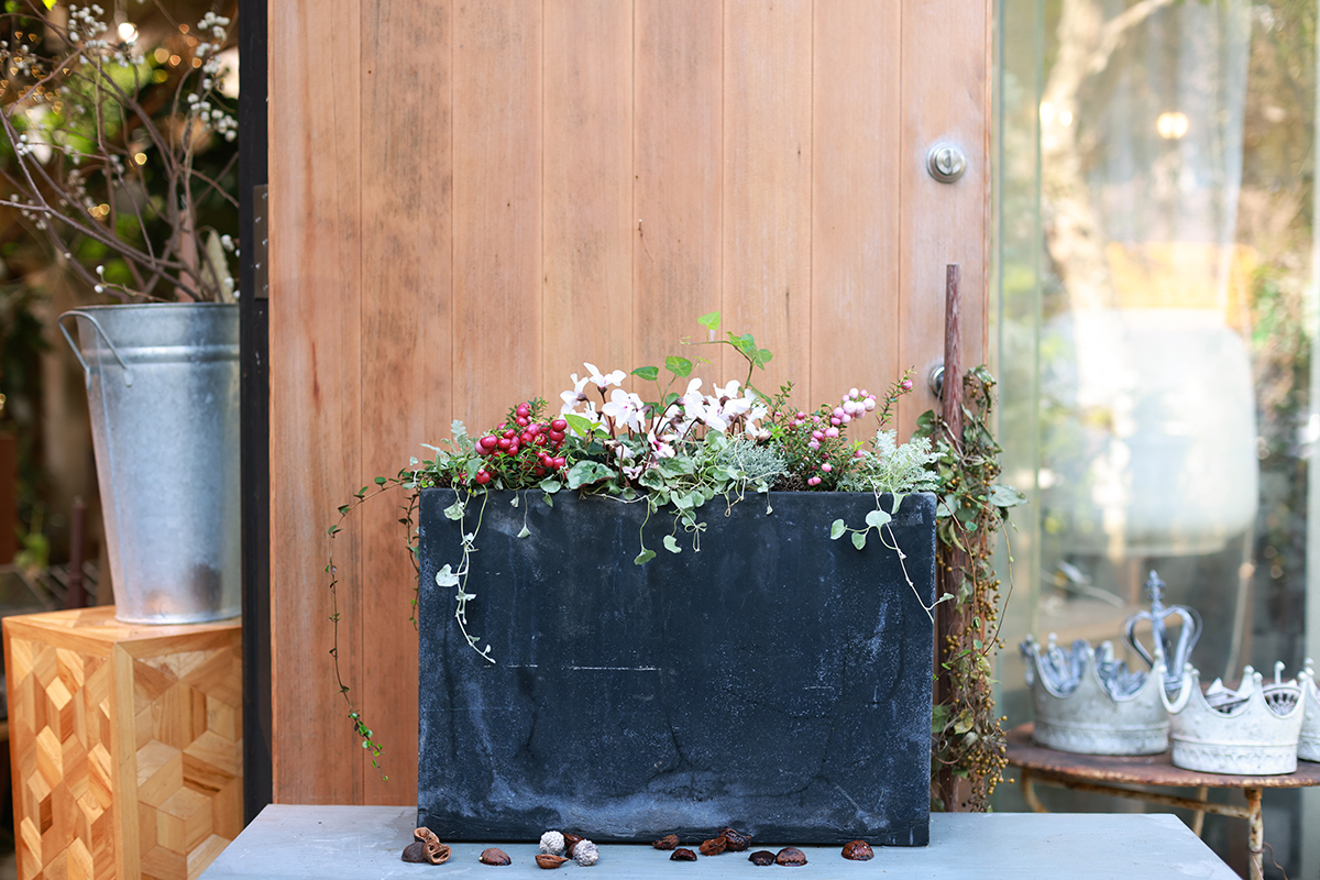 いつ訪れても目の前に広がる丁寧に作られた庭に癒やされて、通り庭を抜けて店先を訪れると、入り口にもクリスマスらしい素敵な寄せ植えが。毎年庭に飾るために買って帰る真紅のシクラメンも置いてありました。