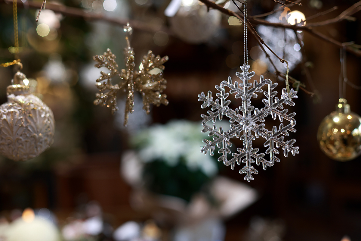 オーナメントを吊るした枝物があったり、オリジナルのリースが置いてあったり。
