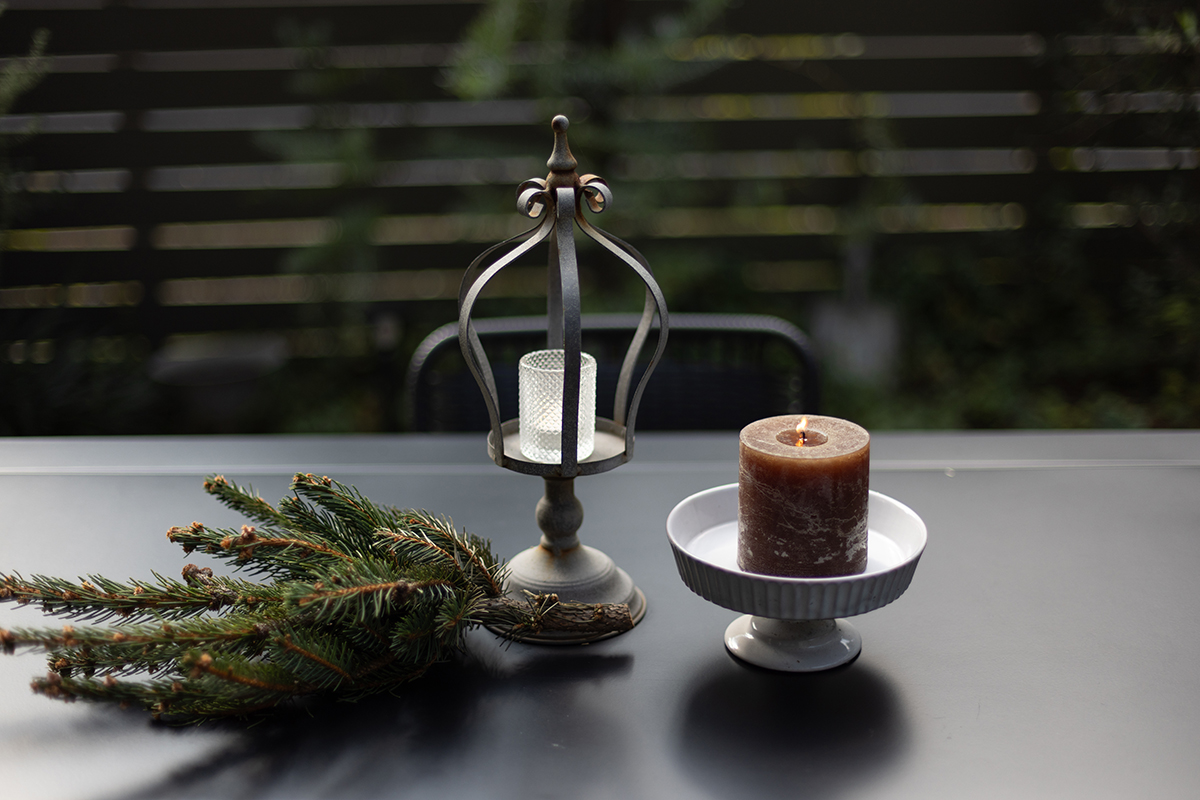 庭に落ちた枯れ葉を拾ったり、置いてある雑貨や家具を拭いたりして、庭をひととおり整えたら、ガーデンテーブルに残りのもみの木と、庭にある雑貨から合うものを選んでしつらえました。
