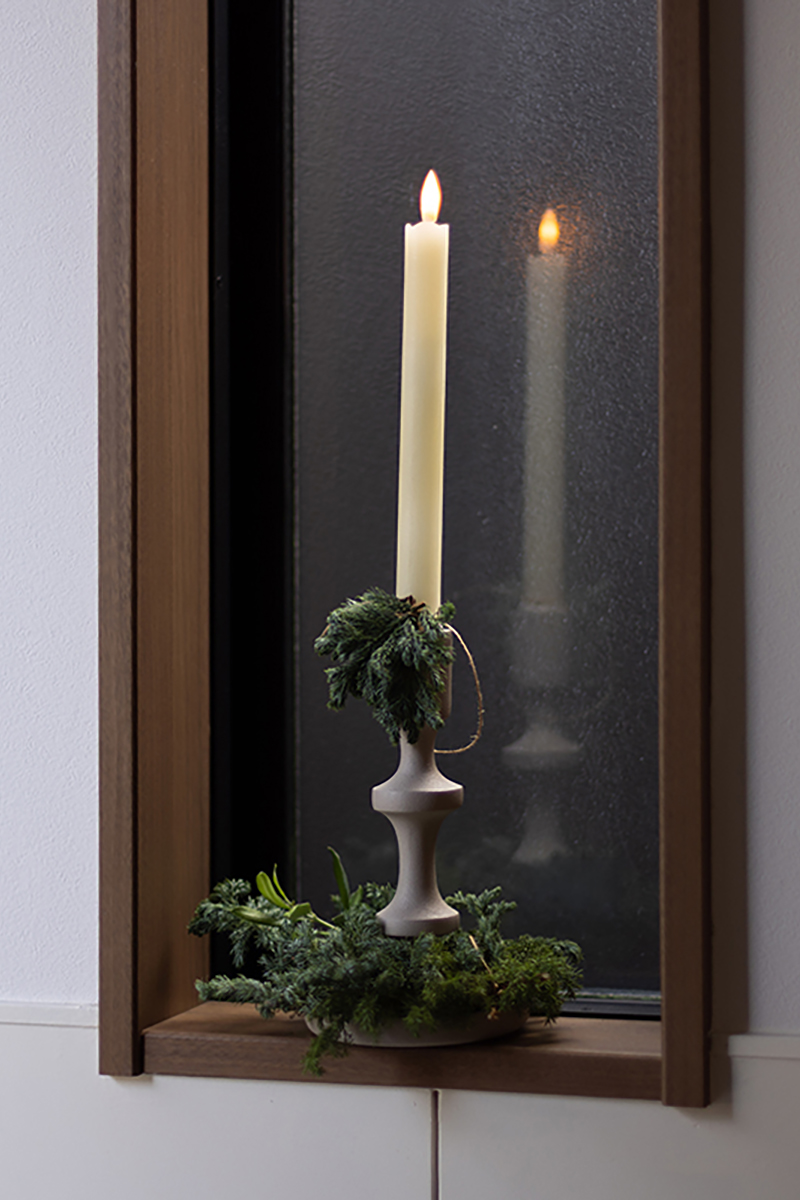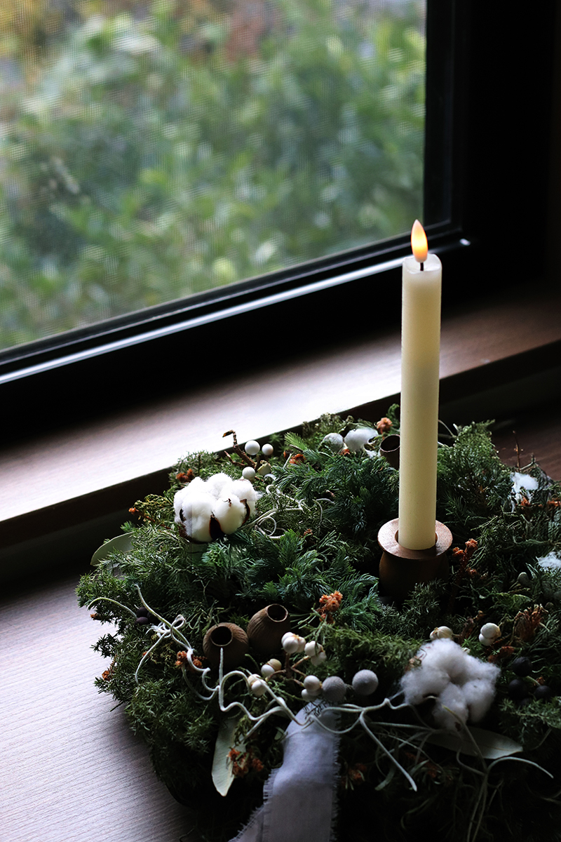 玄関先と2階の窓辺に飾っているLEDキャンドル。足元には薩摩杉をくるりと丸めて添えたり、リースを飾ったり。毎年、LEDキャンドルをこの場所以外にもいくつか飾り、冬の夜の常夜灯がわりにしています。