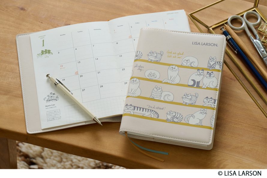 リサ・ラーソンの人気のイラスト「スケッチねこたち」が月替わりで登場する、シンプルでおしゃれなデザインに仕上げました。新しい年のスタートにぴったりで、日々の予定管理から日記代わりまで、幅広く活躍します。