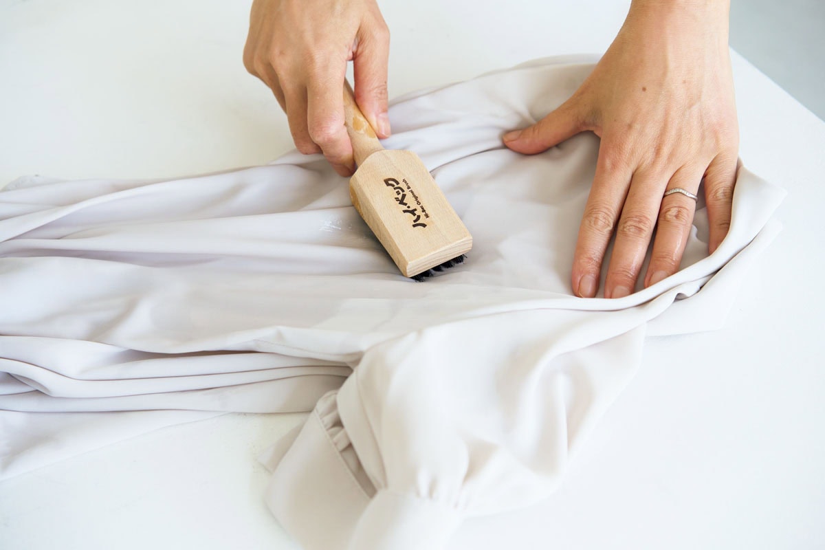 シミ落とし用の専用ブラシ。ほどよい硬さの馬毛を使用し、洗剤をつけて軽く叩くだけで、生地を傷めることなく汚れをやさしく落とせます。