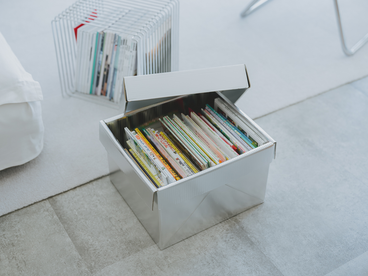 「リビングでは家族で遊ぶボードゲームの収納に、寝室では絵本入れとして活躍中。シルバーのかっこいい佇まいと、頼もしい頑丈さがお気に入りです」