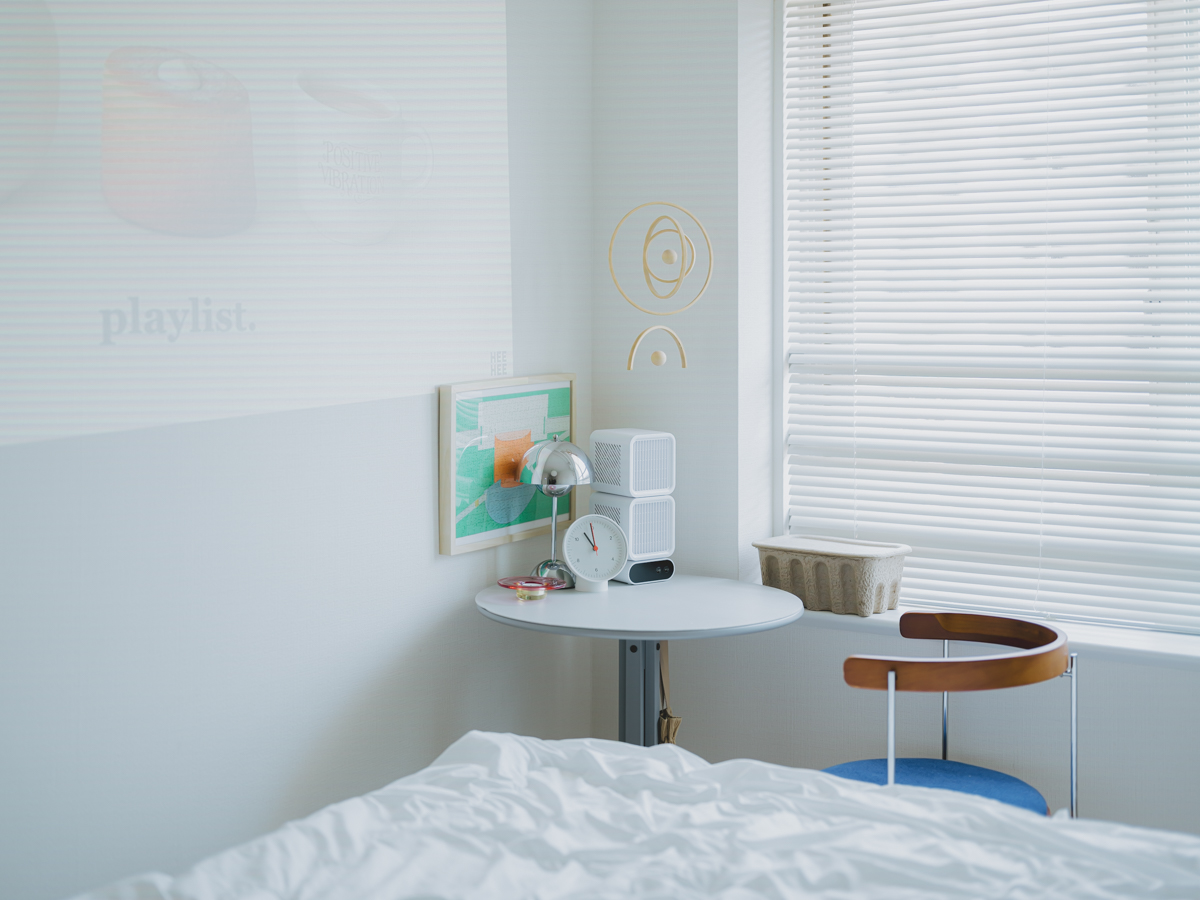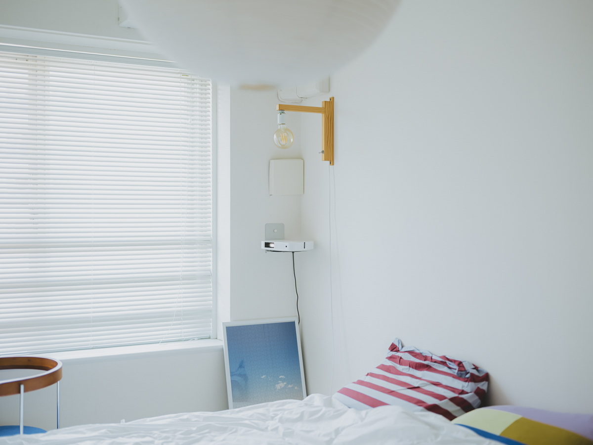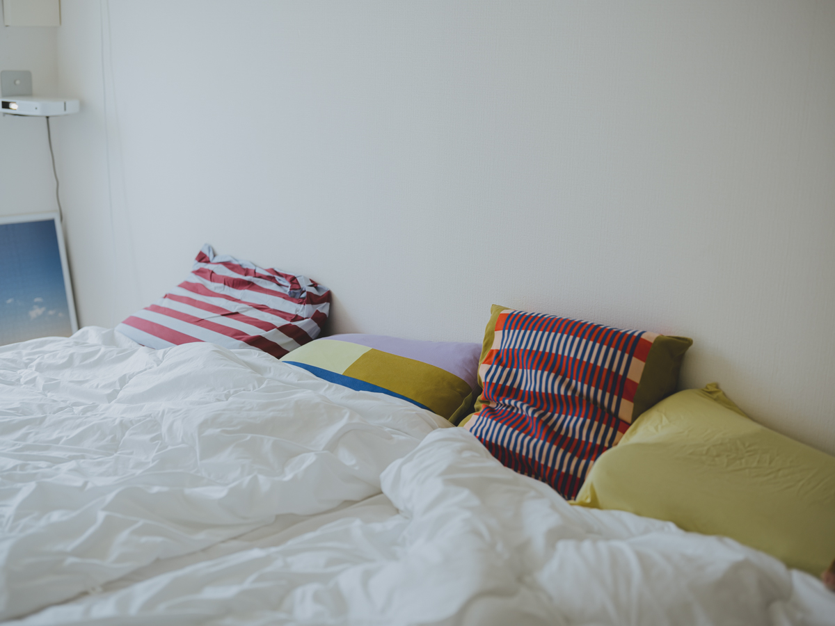 「まくらカバーは主に、IKEAとHAYで購入しました。空間がかわいくなりすぎないよう、照明でバランスを取るように空間を引き締めています」