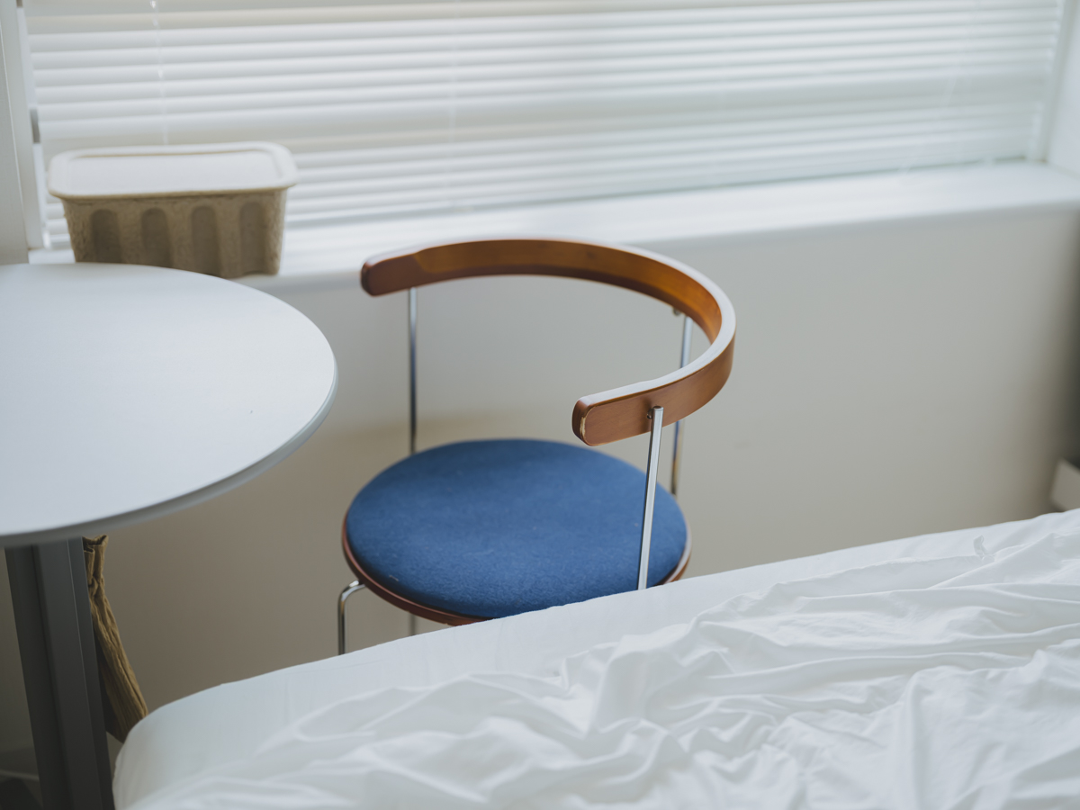 ブルーのチェアが、静かな空間にほどよい彩りを添えています。
