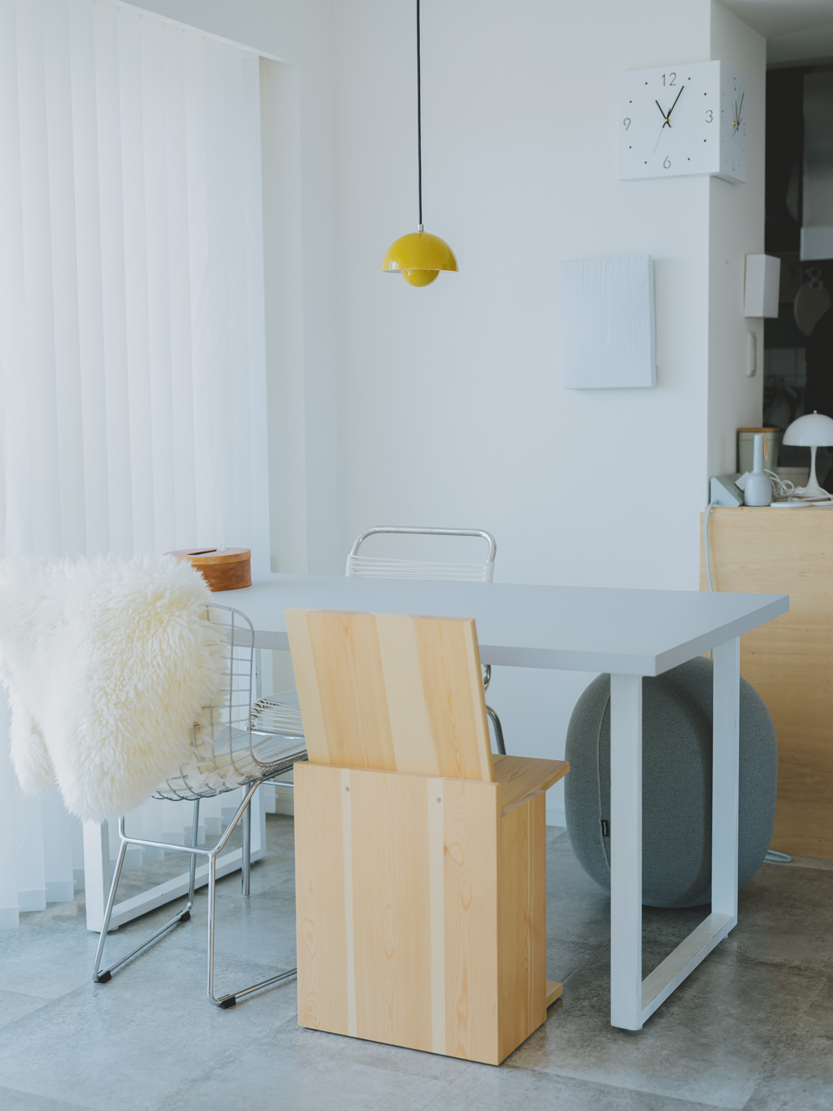 「サブテーブルがあることで、家族それぞれの居場所が生まれ、気持ちにもゆとりが生まれる気がします。リビングで宿題をしたり、食事をとったりと、その時々の過ごし方にあわせて臨機応変に使っています。Stool 60と並べると、親子みたいでお気に入りです」
