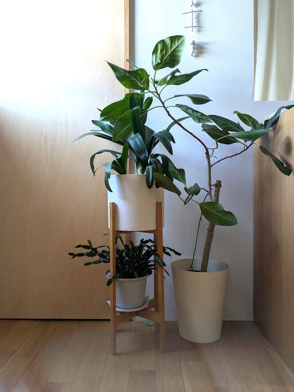 鉢を床に直置きしないでプランタースタンドを使うと、全体の高さが出て、かつ床がすっきりとしお掃除しやすくもなります。