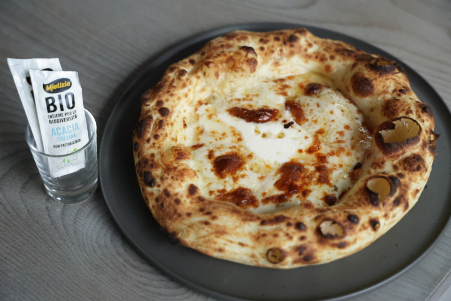「★FNT★」は“ふんわりにっこりとびっきり”の略。ブルーチーズ、マスカルポーネ、はちみつを組み合わせた、ミシュランにも紹介された400℃ピッツァを代表するスペシャリテ。高加水の生地はもちもちなのに軽やか。ブルーチーズのコクと塩気に甘さが加わり、甘塩っぱさがたまらない一枚です。