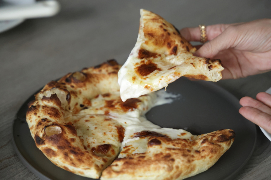 2種類チーズが口の中でとろけて、まるでチーズの海のよう! 濃厚でクリーミー、すべてが完璧なおいしさ。最高です! 生地はパンのようですが、ベースが薄いので軽くて、最後までおいしく、飲めちゃうピザです。