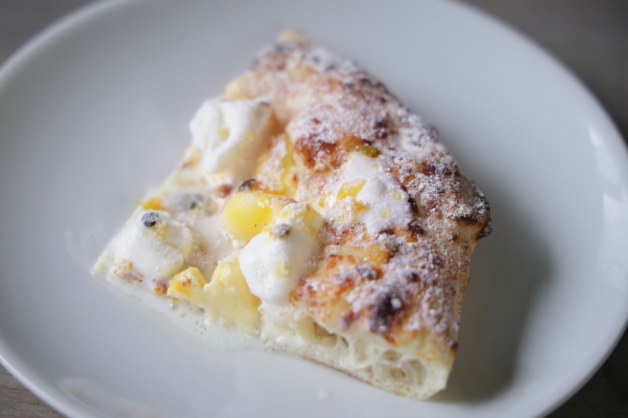 最後にもう一枚! 唯一のデザートピザ「パッシオーネ」は、パッションフルーツ、ミルクアイス、カスタード、モッツァレラの見た目も華やかな一枚。見た目よりも生地が軽く、食べやすいので誕生日などのお祝いにも良さそう。