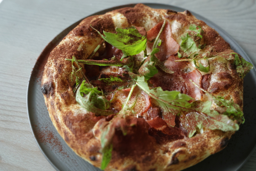 季節限定のピザにも注目。訪れたときにあったのは、栗、ベーコン、粒胡椒、ブルーチーズ、ルッコラ、カカオ、モッツァレラの「テラ」。味の想像がつかない、ほかでは食べられない組み合わせですが、栗とカカオの風味とブルーチーズの塩味が絶妙なバランス。おしゃれな味わいの一枚です。