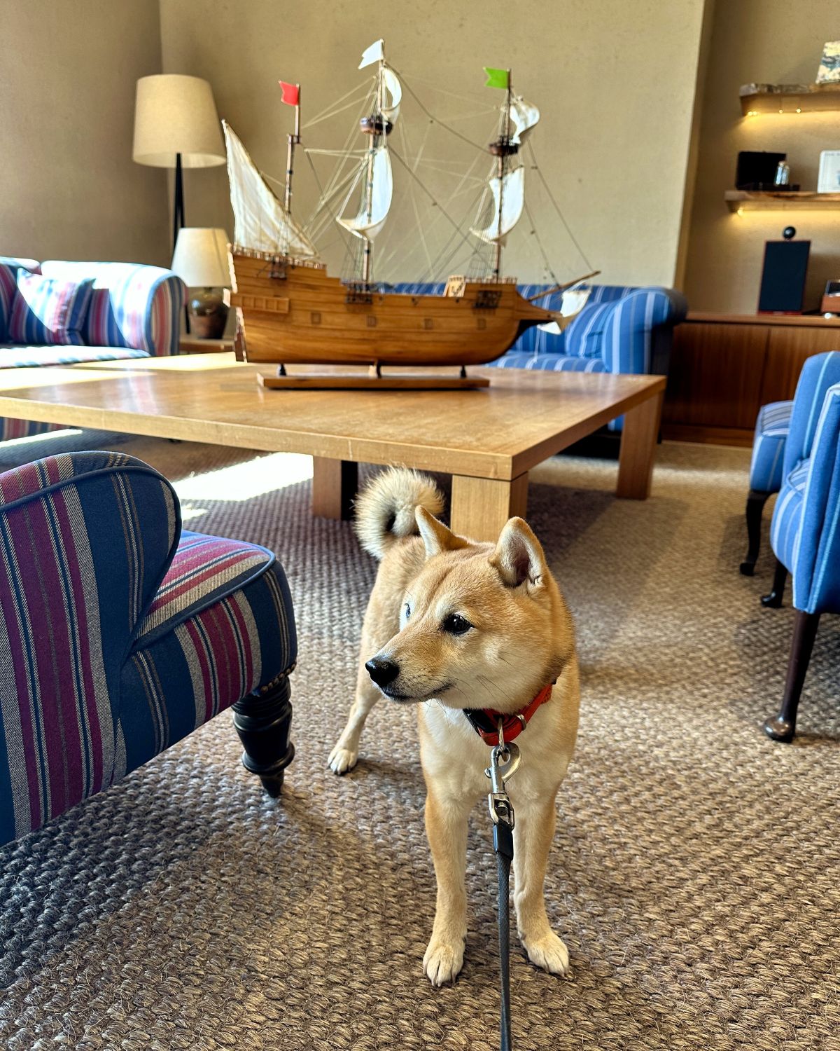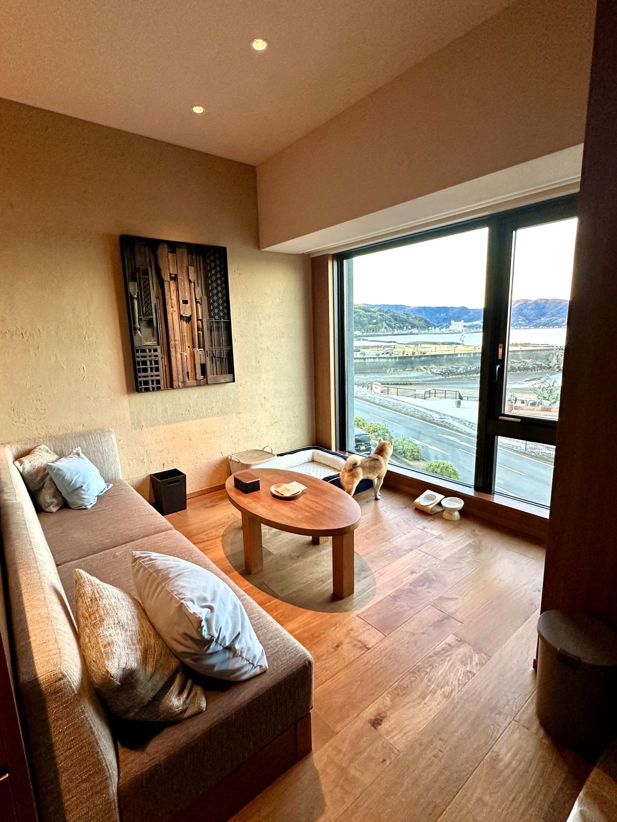 「界 アンジン」のドッグルームでは、部屋のソファやベッドの上に愛犬が乗っても大丈夫。こういったドッグフレンドリーなところが嬉しいですよね。まもると一緒にソファに座り、海を見ながらゆったりと過ごすことができました。
