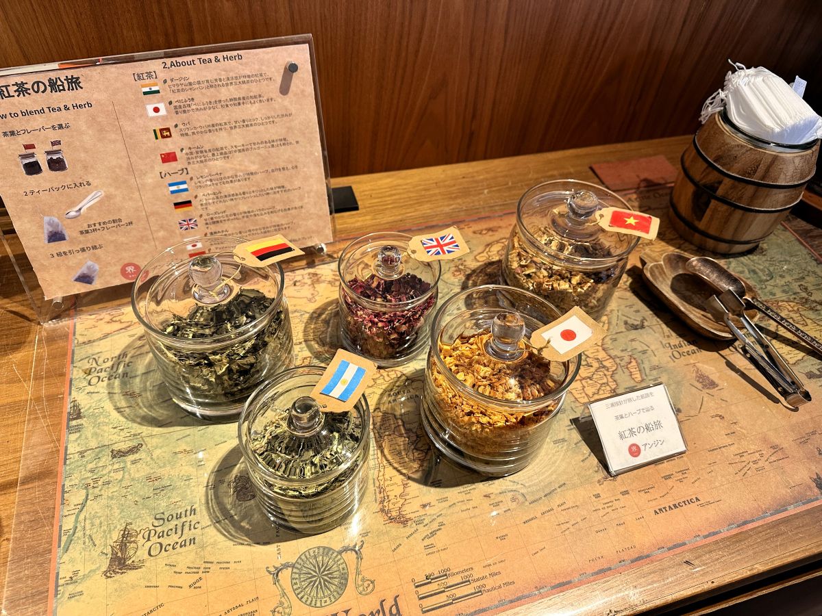 トラベルライブラリーでは、「紅茶の船旅」と題して世界中のさまざまな茶葉が用意されていました。この茶葉は、按針が旅した実際の航海ルートに沿って選んだ、その土地ならではの茶葉やハーブを使ったフレーバーティー。好みでブレンドして楽しむこともできます。