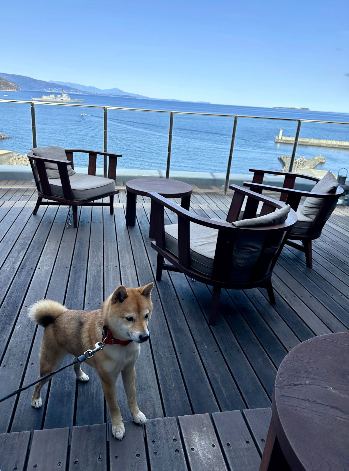このデッキ、按針が日本で初めて造船した西洋式帆船「サン・ブエナ・ベントゥーラ号」の甲板をイメージしてつくられたのだそう。8階からの展望は、部屋から見るよりもさらに海との一体感を感じられ、最高に気持ちがいい空間。もちろんワンコも一緒に来ることができます。