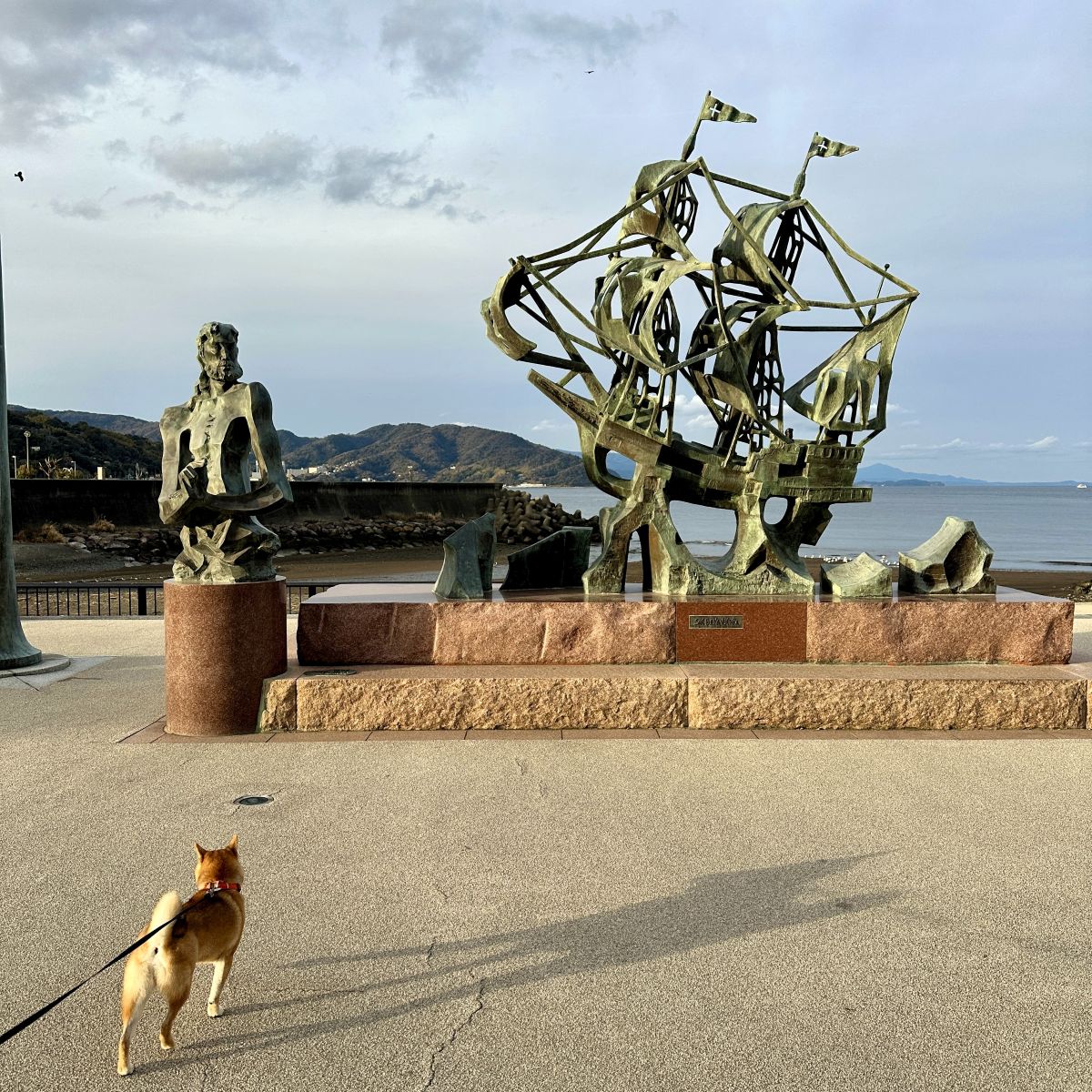 海沿いに渡ると、まず目に入るのが「按針メモリアルパーク」。堂々とそびえる帆船のモニュメントや三浦按針の胸像が印象的! この横には公園も広がっていて、ワンコとのお散歩に最適です。