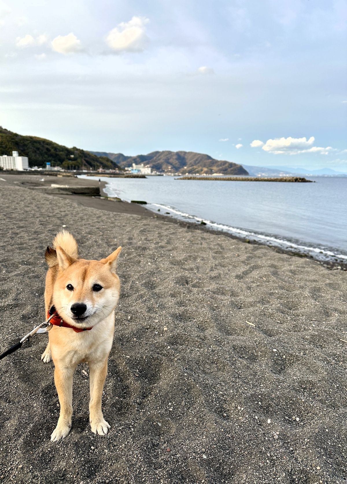 按針メモリアルパークを過ぎると、砂浜が広がるビーチに到着。海は何度か立ち寄ったことはありますが、ゆっくりと砂浜をお散歩するのは初めてのまもる。怖がって波打ち際には行くことができませんでしたが、砂を掘ったり私と一緒に走ったり、とても楽しそう! 朝夕何度も訪れ、いい思い出になりました。