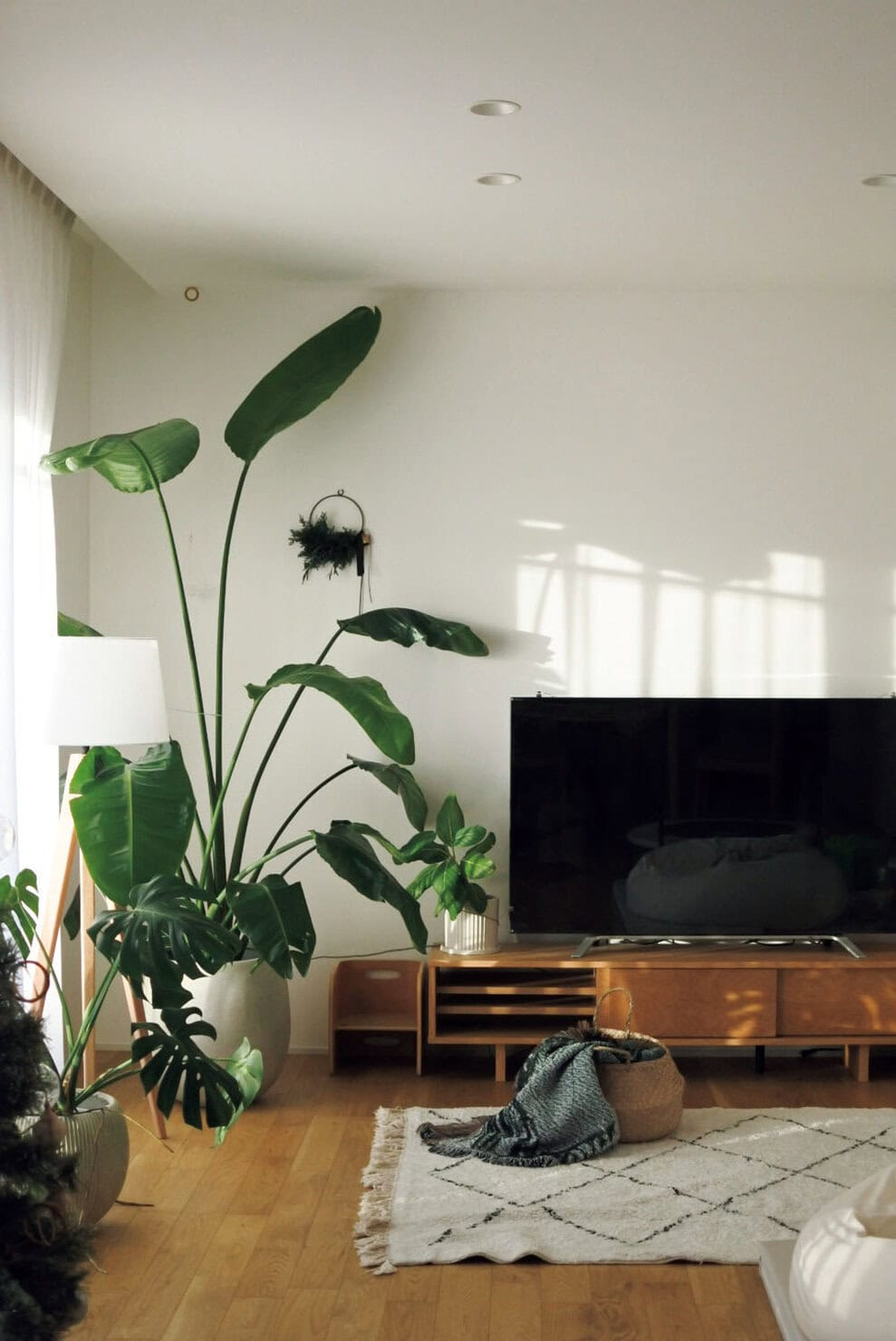 南向きで明るいリビングは、四季折々で少しずつ違う光の影が見られます。観葉植物たちもお日さまをたっぷり浴びて、すっかり大きくなりました。子どものおもちゃも並ぶ、家族みんなの憩いの場です。