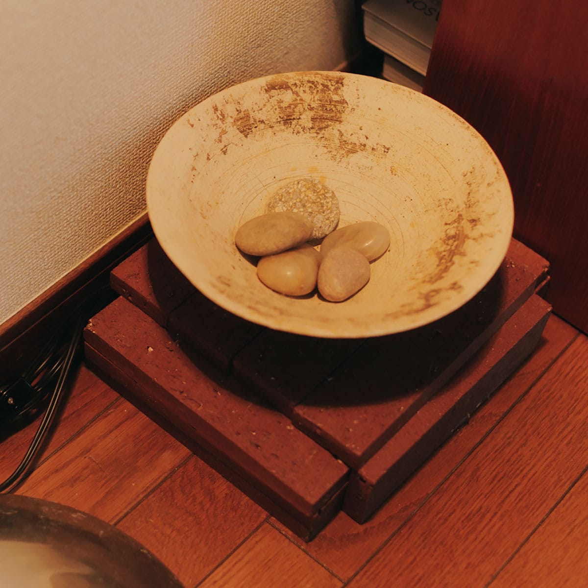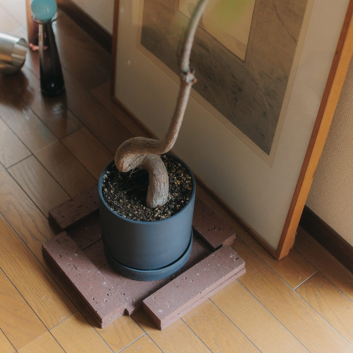 清澄白河のギャラリー『STOOP』が、愛知県瀬戸市の老舗窯業会社と共同開発したオリジナルのレンガタイル。それを一枚ずつ積み重ね、電源コード隠しやプラントスタンドとして活用しているのも、岩佐さんらしい工夫のひとつです。