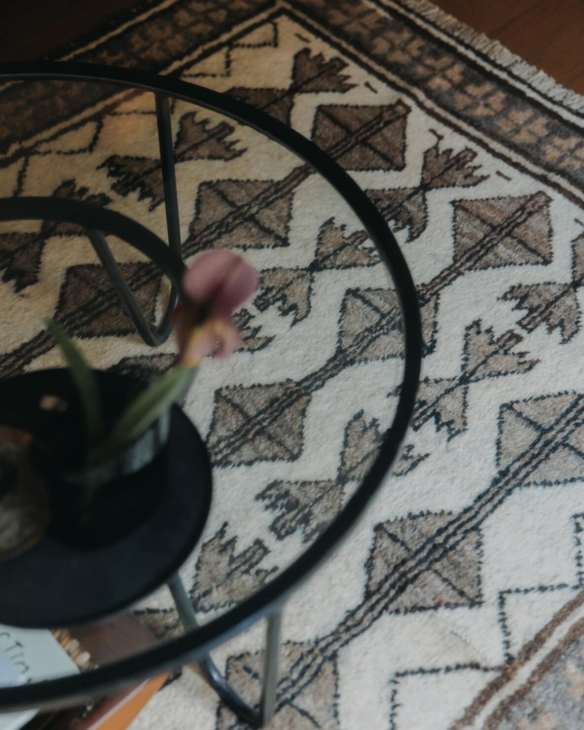 そして、リビングのラグは、東北沢の『Floor and Wall』で購入したアフガニスタンの遊牧⺠タイマニ族が織ったもの。ベージュと白を軸にした柄が、空間になじみながら、ソファやクッション、ローテーブルの黒をやわらかくつないでいます。