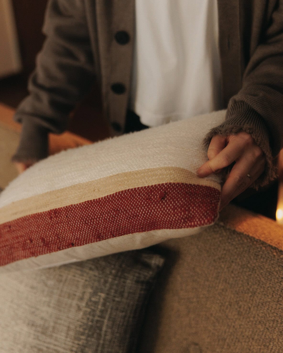 「季節ごとにクッションカバーの色や素材で気分を変えています。織りやニュアンスのある素材を選んで、空間に立体感が出るように。ポイントで赤を取り入れることもあります」