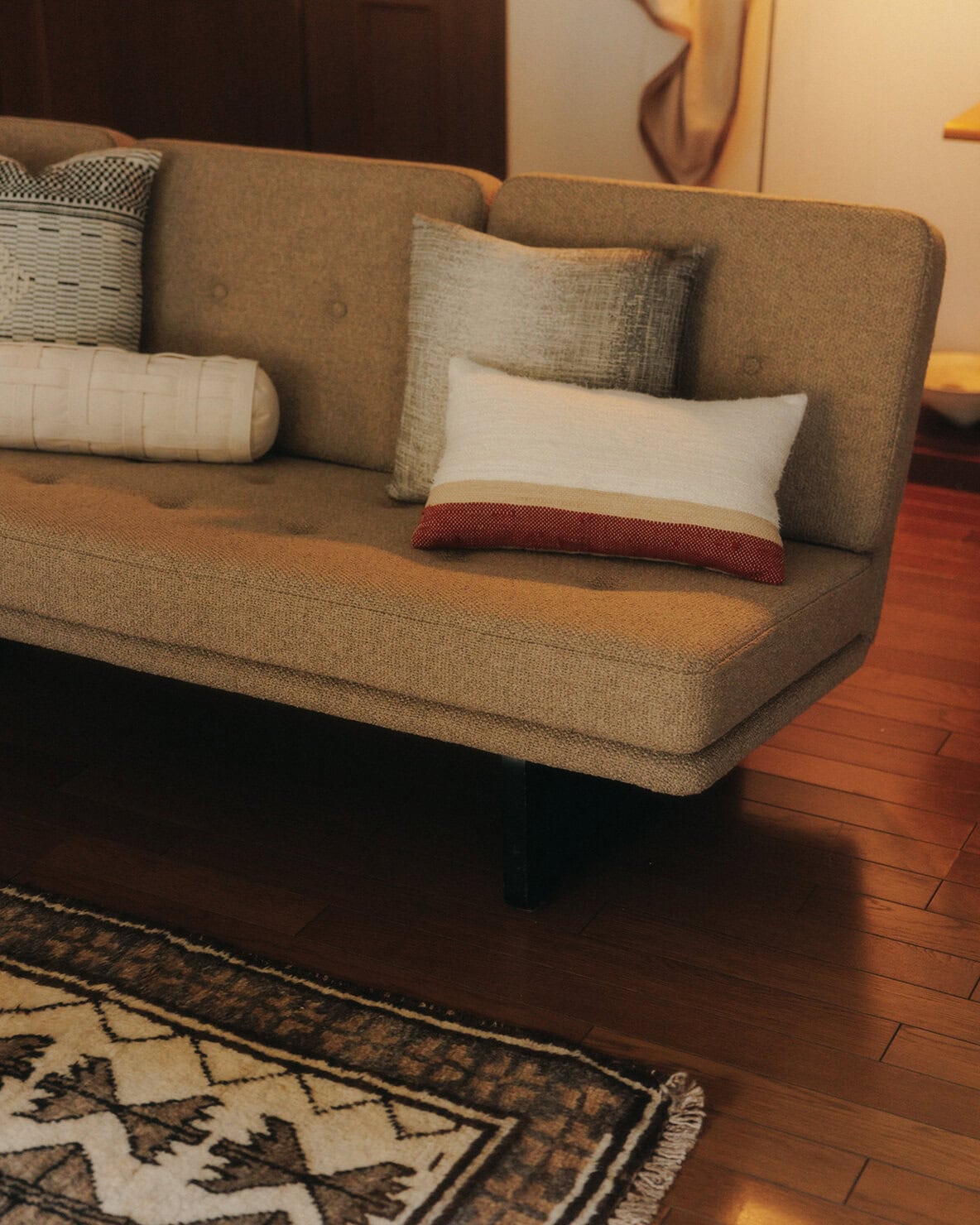 「このクッションは、着物の古い布を裂き織りで丁寧に仕立てたものです。伝統的な素材を現代のホームウェアとしてよみがえらせていて、手仕事ならではの温かみが気に入っています。Public Craftsさんのものづくりは、障がいのある方の支援につながる取り組みや、工場に眠っていた古い生地を生かす活動など、背景にも惹かれるものがあって。そうした姿勢も含めて、心地よいと感じています」