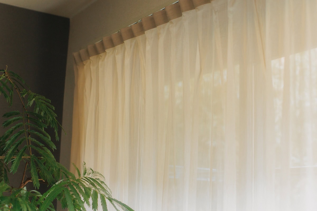 また、岩佐さんのお気に入りのアイテムの一つがこちらのカーテン。リビングとダイニングにやわらかな光を通し、部屋に静かな奥行きを生み出しています。