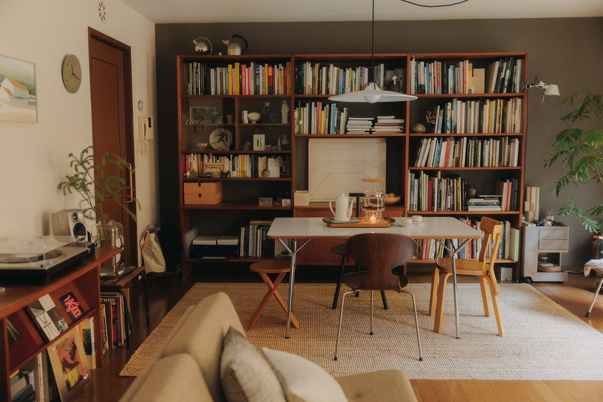 「今回の部屋は日当たりがやわらかく、床もダークブラウンなので、新調した家具はヴィンテージのチーク材で揃えました。今までの住まいよりもしっとりと落ち着いた雰囲気になった気がします。どこか実家のような親しみのある設えや間取りなので、自然と安心感のある空間になりました」