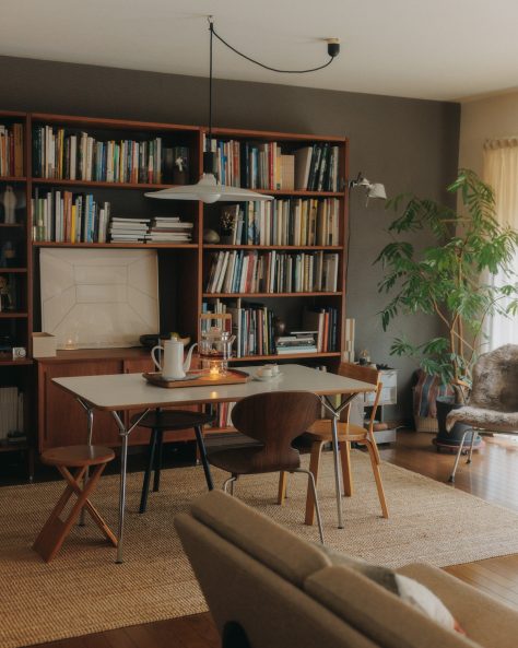 岩佐さんがちょうど1年前から暮らし始めた、都内の賃貸マンション。やさしい光が差し込むリビングダイニングには、ヴィンテージ家具を軸に静かなトーンで整えられた空間が広がります。