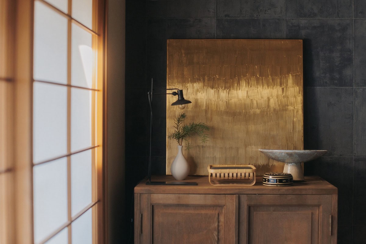 「この金箔のアートは、和の空間によくなじむんです。光を受けたときのきらめきが本当に美しくて、いつも癒やされています。決して明るい家ではありませんが、少し落ち着いた光だからこそ、その美しさをより感じられるのかもしれません」