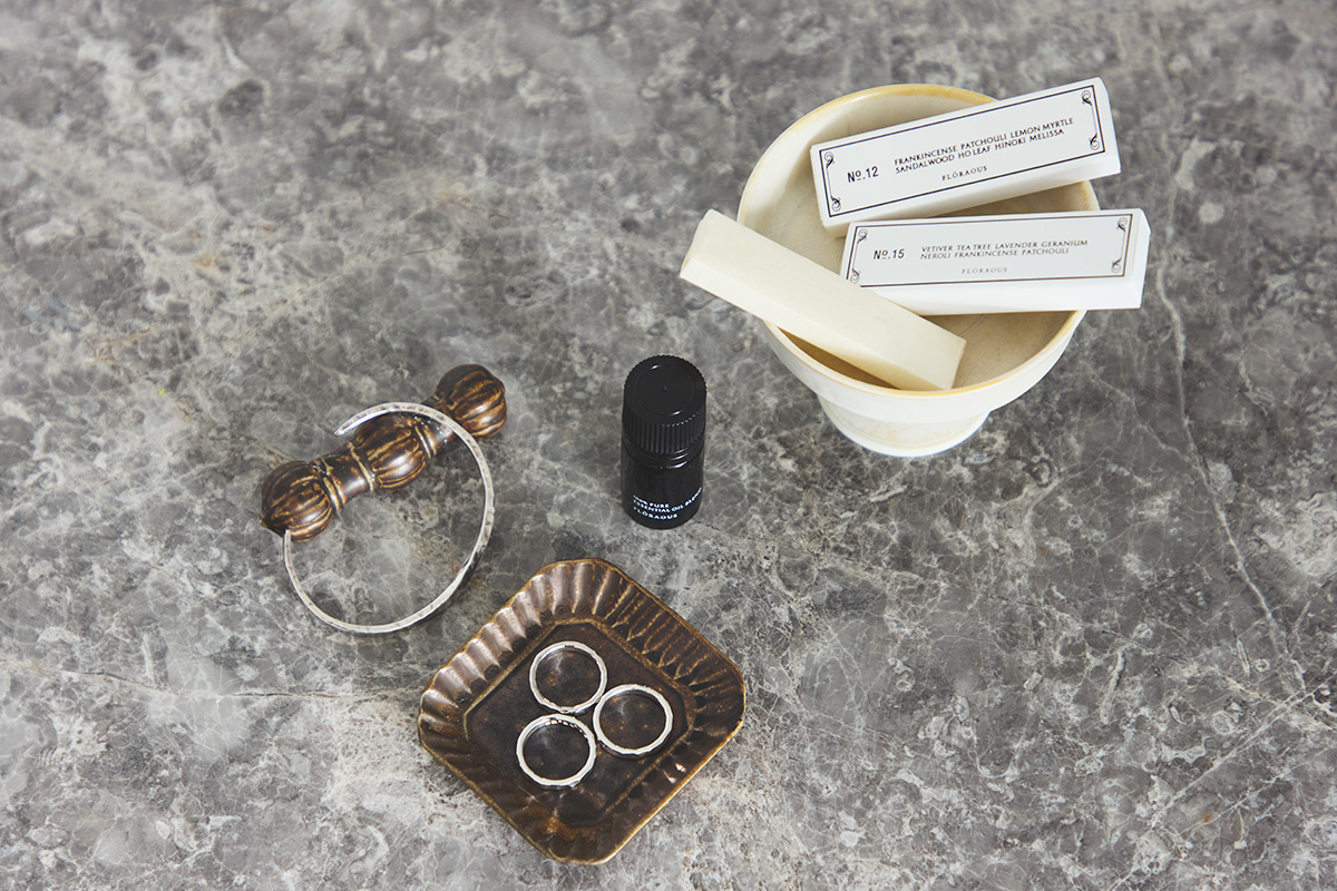 〈左から〉シルバー3連リング¥49,500、シルバーバングル¥55,000/ともに市松、ピュアエッセンシャルオイル¥4,400、アロマサシェ各¥2,310/すべてフローラス