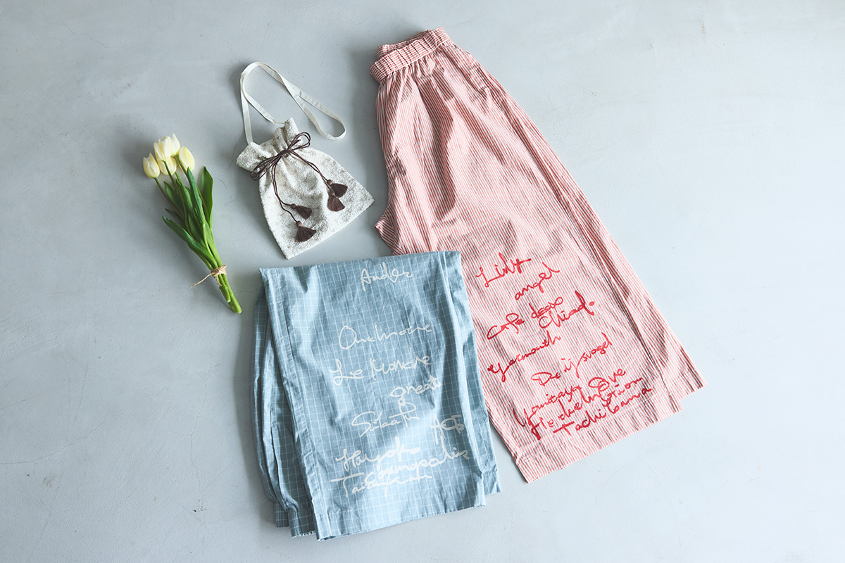 滝口さんが菊池亜希子さんと手がけるものづくりプロジェクト「fofofofa」から、“忘れたくない場所”への想いを込めてプリントしたデュエルパンツ。インドの伝統的な手仕事を生かしながら、日常に寄り添う服づくりを行うブランド「ブノン」と手がけた巾着バッグも素敵です。