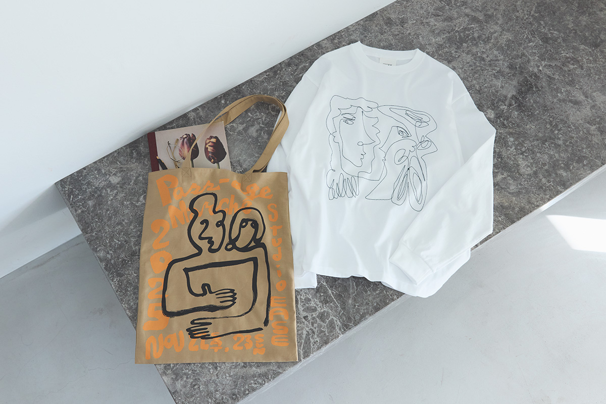 「澤田美野里さん(heso)のドローイングが映える2アイテム。トートバッグのプリントには、プリント工場で捨てられてしまう予定だったインクをレスキューして再利用しています」