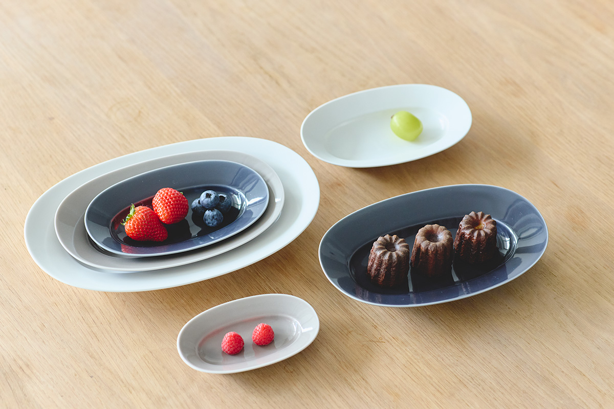 横長のフォルムが料理をきれいに見せてくれて、盛りつけもどこかこなれた印象に。和洋問わず、どんな料理でも受け止めてくれるおおらかな器。SS〜Lまでの4サイズ展開。