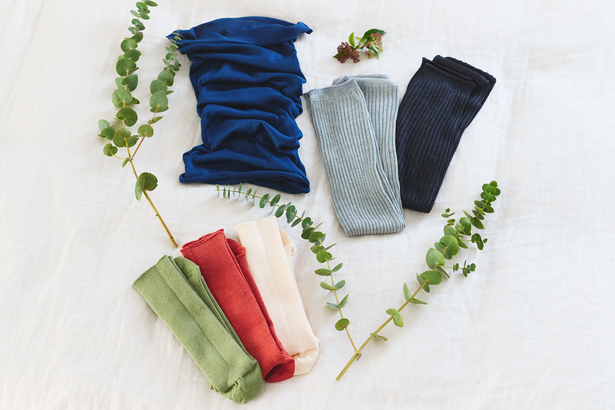 〈左上から〉シルクネックウォーマー¥4,950、シルクアームウォーマー各¥4,070、ソックス各¥1,650/すべてハミングバード
