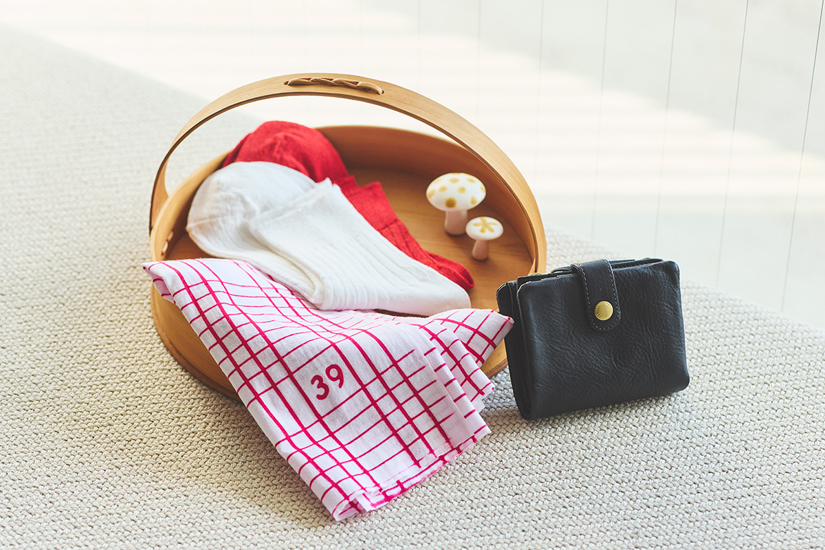 〈左から〉39格子手ぬぐい¥1,320/hal、リネンリブソックス各¥2,310/フォグリネンワーク、2つ折り財布¥22,000/サンク、その他/スタイリスト私物