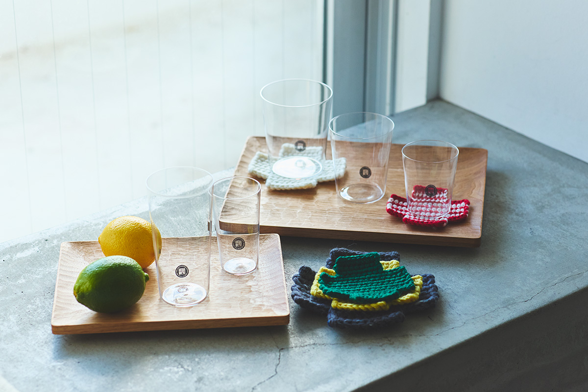 〈左から〉くるみ材トレー 小¥14,300、大¥22,000/ともに山口和宏、うすはりグラス タンブラー L¥2,640、S¥1,760、オールド L¥2,750、M¥2,200、S¥1,870/すべて松徳硝子、クロスマット XL¥3,960、M¥1,870、 S¥1,320/すべてハサタニフミヨ
